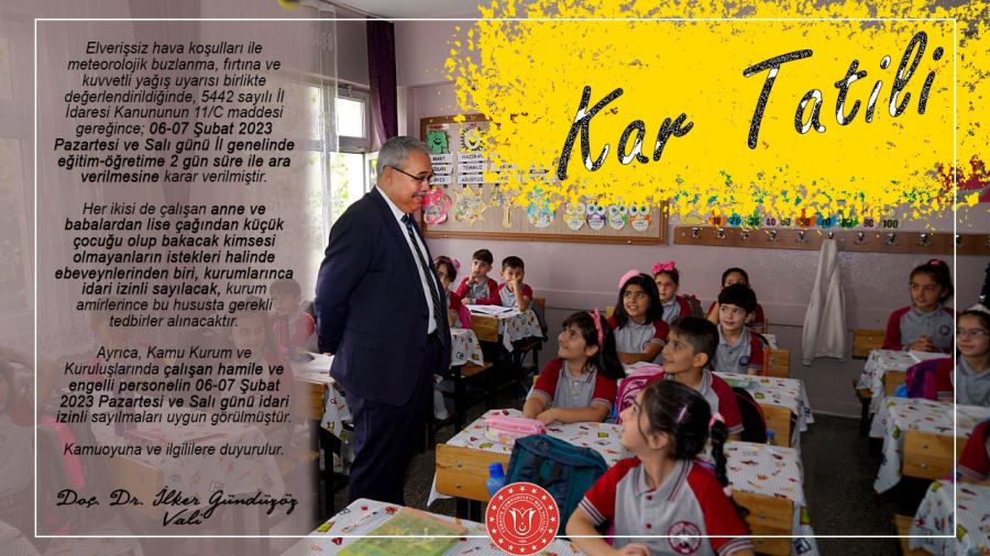Konu ile ilgili olarak Muş Valiliğinden yapılan açıklamada 06-07 Şubat 2023 Pazartesi ve Salı günü İl genelinde eğitim-öğretime 2 gün ara verildiği belirtilen açıklamada şu ifadelere yer verildi: “Elverişsiz hava koşulları ile meteorolojik buzlanma, fırtına ve kuvvetli yağış uyarısı birlikte değerlendirildiğinde, 5442 sayılı İl İdaresi Kanununun 11/C maddesi gereğince; 06-07 Şubat 2023 Pazartesi ve Salı günü İl genelinde eğitim-öğretime 2 gün süre ile ara verilmesine karar verilmiştir.