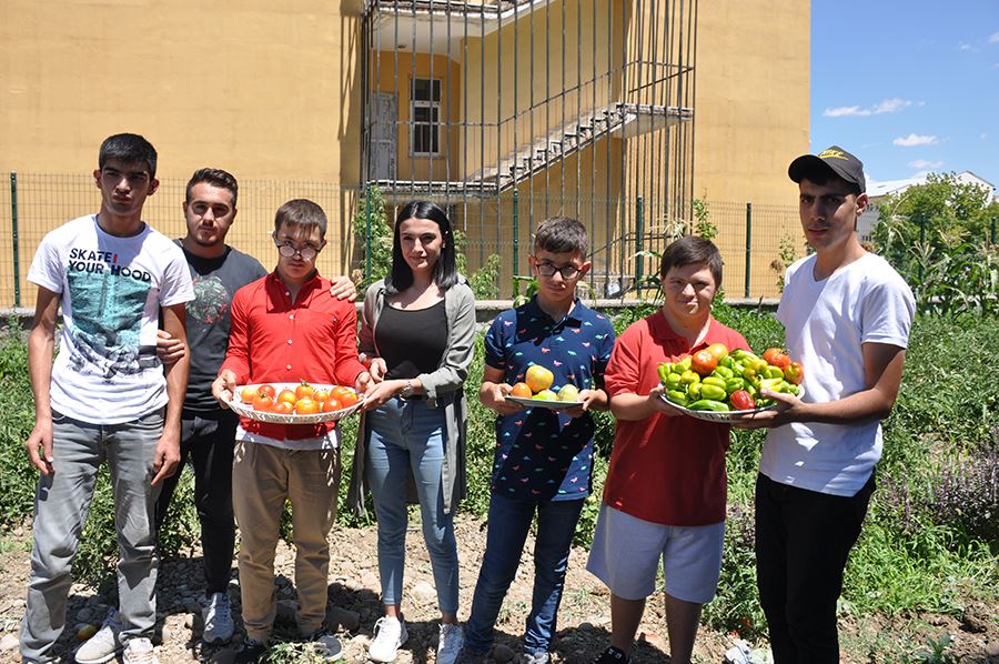 ÖZEL BAHÇEDE YETİŞEN ÜRÜNLER ÖZEL ÖĞRENCİLER TARAFINDAN TOPLANIYOR