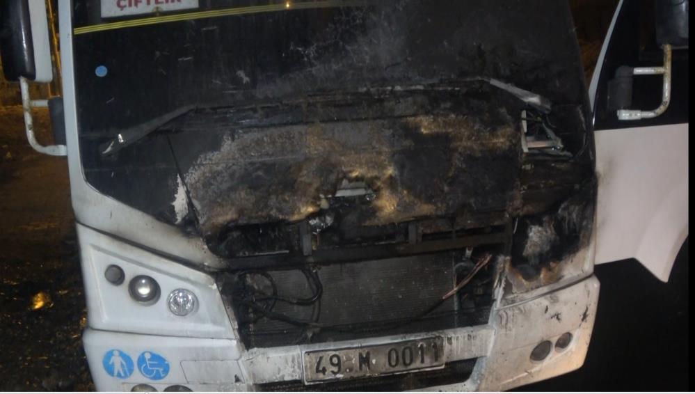 Muş’ta park halindeyken aniden hareket alarak yokuş aşağı ilerleyen 49 M 0011 plakalı yolcu minibüsünde bilinmeyen bir nedenle yangın çıktı. Alev alev yanan araçta maddi hasar meydana geldi.