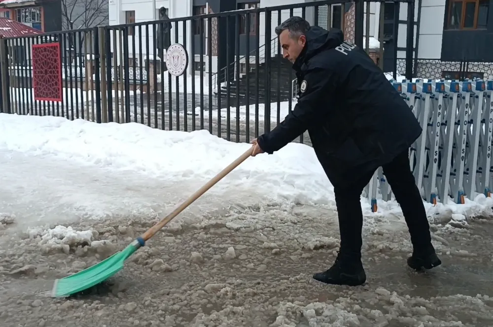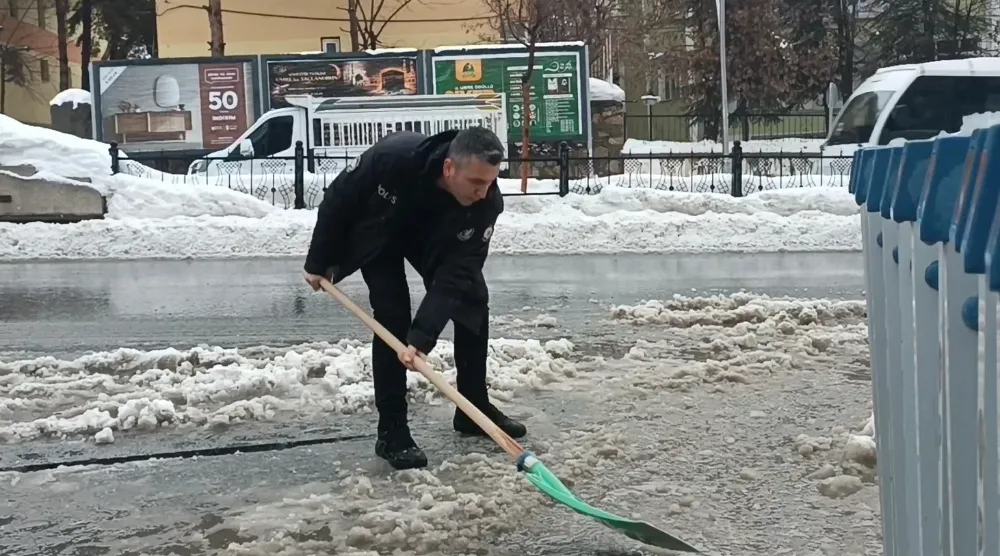 Kentte etkili olan yoğun kar yağışı sonrası eriyen kar suları cadde ve kaldırımları adeta göle çevirdi. Vatandaşların su birikintisi nedeniyle ilerleyemediğini gören bir polis, çevreden temin ettiği kürekle rögar yönüne doğru suyu akıtmaya başladı. Kısa sürede yapılan müdahale sayesinde kaldırım ve yol üzerindeki su seviyesi düşerken, vatandaşlar güvenli şekilde geçiş yapabildi. Polis memurunun bu duyarlı davranışı çevrede bulunan vatandaşların da takdirini topladı.