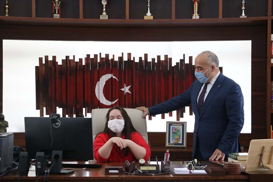 Muş Faaliyet gösteren Ali Kuşçu Özel Eğitim Uygulama Okulunda eğitim gören Down Sendromlu çocuklar Muş Alparslan Üniversitesi (MŞÜ) Rektörü Prof. Dr. Fethi Ahmet Polat,ı “21 Mart Down Sendromlular Farkındalık Günü” münasebetiyle ziyaret etti. Down sendromlu gençleri makamında ağırlayan Rektör Polat, temsili olarak makamını öğrenci Rabia Güngör’e bıraktı.