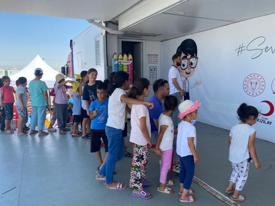 Kahramanmaraş'ın Türkoğlu ilçesinde "Sevgi ve sağlık tırı projesi" kapsamında konteyner kentte kalan çocuklara göz taraması yapıldı.