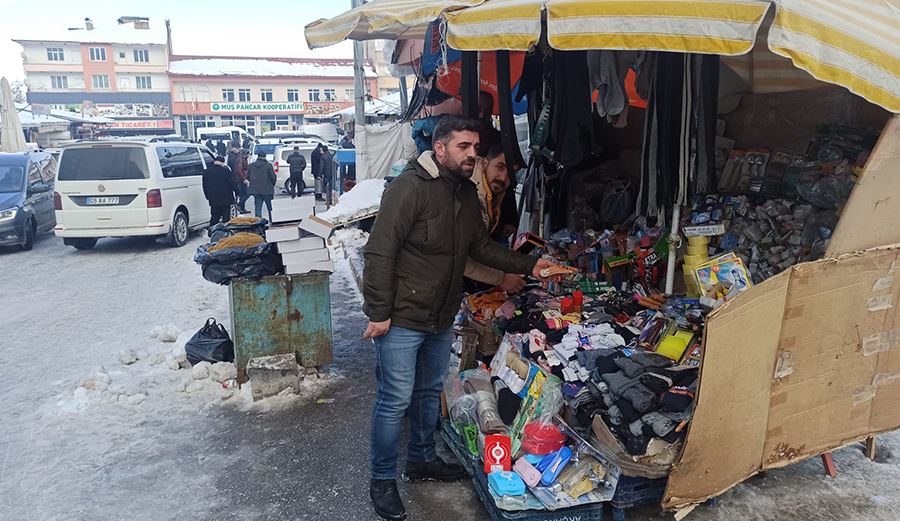 8 nüfuslu ailesine baktığını söyleyen Şahin Polat isimli bir diğer vatandaş ise şunları dile getirdi; “Ekonomik sıkıntılar vatandaşları olumsuz etkiliyor. Bir günde 500 TL satış yaptığımı günleri hatırlıyorum. Ama son zamanlarda artık satış bile yapamadan tezgâhımızı kapatıyoruz. 8 nüfuslu aileme bakıyorum, günde elde ettiğim kar sadece 40-50 TL, bununla zar zor geçiniyorum. Benim tarlam var fakat ekecek mahsul bulamıyorum. 6-7 ay boyunca kar altındayız. Geçimimizi sağlamak için seyyar satıcılık yapıyorum. Yol kenarlarında kaldırımlarda olduğumuz için soğuk hava ve kardan dolayı çok etkileniyoruz. Muş’ta fabrika da yok çalışalım. Batıya gidecek çarem de yok çünkü evliyim. Bu durumda bu soğuk havada çaresizce çalışıyorum. Karın yağışı bizi her ne kadar etkilese de çiftçilere faydası oldu. Geçtiğimiz yaz çok kuraklık vardı. Bu yıl geçen yıla oranla kar fazla yağdı. Her ne kadar bizler kar yağışından etkilensek de kuraklığın olmaması için güzel oldu. Bizim için de kapalı ortamlarda satış yapacak mekanlar olsaydı güzel olurdu. En azından kış mevsimi bu kadar etkilemezdi. Ekmek mücadelesi verdiğimiz bu günlerde Allah yardımcımız olsun. Tüm seyyar satıcı arkadaşlarımızın tek geçimi buralarda satacağı üç beş kuruşluk para ile oluyor” şeklinde konuştu.