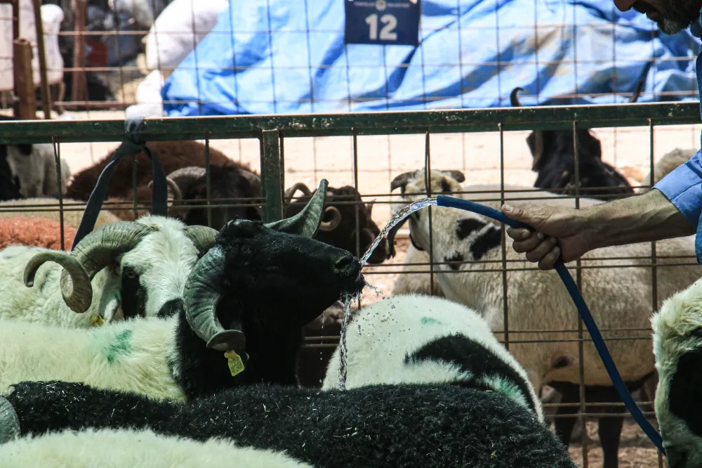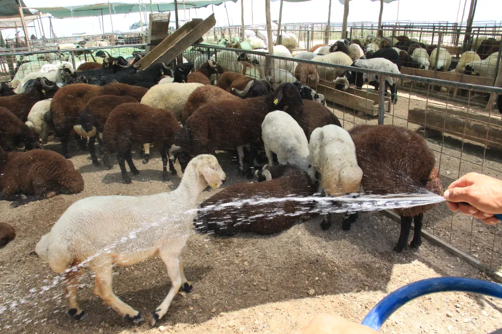 Mersin'de sıcak hava insanları olduğu kadar kurbanlıkları da olumsuz etkiledi. Kurbanlıkları sıcaktan korumak için üzerlerine file örten satıcılar, hayvanların bulunduğu alanı da sık sık sulayarak serin tutmaya çalışıyor.