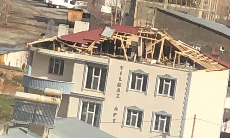 Muş’ta fırtınanın etkisiyle uçan çatının altında kalmakta son anda kurtulan vatandaşların görüntüleri güvenlik kamerasına yansıdı. Hürriyet Mahallesi’ne bağlı Eski Hal içerisinde meydana gelen olayda, Bir iş yerine ait çatı, fırtına nedeniyle yerinden koptu. Çatının kopmasıyla o sırada caddeden geçen vatandaşlar, üzerlerine gelen sac yığınından şans eseri kurtuldu. Çatının uçma anı ise güvenlik kamerası tarafından kaydedildi.