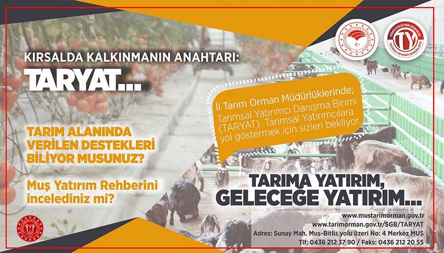 Tarım sektöründe yatırımların artarak devam etmesi, kaynakların etkin ve verimli kullanılması, tarım-sanayi entegrasyonun sağlanması, ülke istihdam ve kalkınmasına katkı sağlamak amacıyla Muş İl Tarım ve Orman Müdürlüğü'nde kurulan "Tarımsal Yatırımcı Danışma Ofisi (TARYAT)ile tarım-orman alanında yatırım yapmak isteyen ulusal ve uluslararası yatırımcılara Muş’taki fırsatlar, tarım sektörüne sağlanan destek, hibe ve teşvikler hakkında bilgi vererek yol gösterilecek. Kurulan ofis tarımsal yatırımcıların karar alma ve uygulama süreçlerine yardımcı olacak.