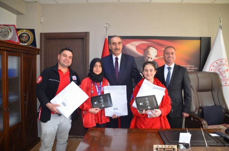 Öğrenci ve öğretmenleri makamında ağırlayan Müdür Kıvanç, başarılarından dolayı öğrenci ve öğretmenleri tebrik ederek hediye takdim etti.