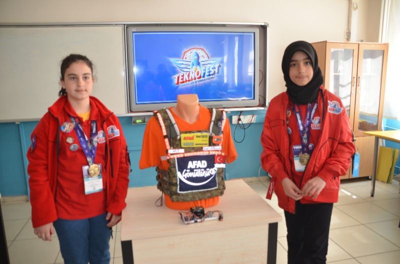 Öğrencilerden Fatma Betül Yıldırım ise, birinci oldukları projenin AFAD çalışanlarının işini kolaylaştıracağını ifade ederek; “6 ilimizi etkileyen büyük bir deprem faciası yaşandı. Bu depremde binlerce kişi hayatını kaybetti. Hem maddi hem de manevi olarak olumsuz şeyler yaşandı. Bizde önümüzdeki afetlere önlem alabilmemiz için bu yeleği ürettik. Bu projeyi yaparken sadece T3 Vakfından destek aldık. Bu yelek ile amacımız AFAD saha çalışanlarının işlerini kolaylaştırabilmektir. Yelemizin üzerindeki sensörlerden başlayarak sizlere tanıtmak isterim. İlk sensörümüz titreşim sensörüdür. Titreşim sensörünün içinde küçük metaller bulunur. Bu metaller sallandığında kişinin harekete geçtiği algılanır. Bunu bırakmamızdaki sebep eğer AFAD çalışanı bayılır yada enkaz altında hareketsiz kalırsa yelek otomatik olarak alarm vermeye başlar” şeklinde konuştu.