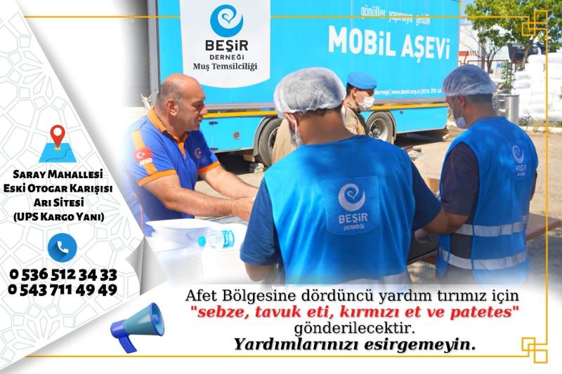 Beşir Derneği Muş İl Temsilcisi Mehmet Şah Sümer, vatandaşlara yardım çağrısında bulunarak; “Gün birlik olma günü. Deprem bölgelerine gönderilmek üzere battaniye, mont, bot, gıda, ısıtıcı, çocuk bezi, mama, ekmek, su ve kefen gibi temel ihtiyaç yardımları göndermeye devam ediyoruz. Toplamda 3 tır malzemeyi deprem bölgelerine ulaştırdık. Bugün de deprem bölgesinde olan mobil aş evimiz için et, sebze ve patates toplayıp bir tır malzemeyi göndermek için tüm gönüllerimiz ile beraber gayret ediyoruz. Muşlu kardeşlerimizden ve gönüllülerimizden destek bekliyoruz” dedi.