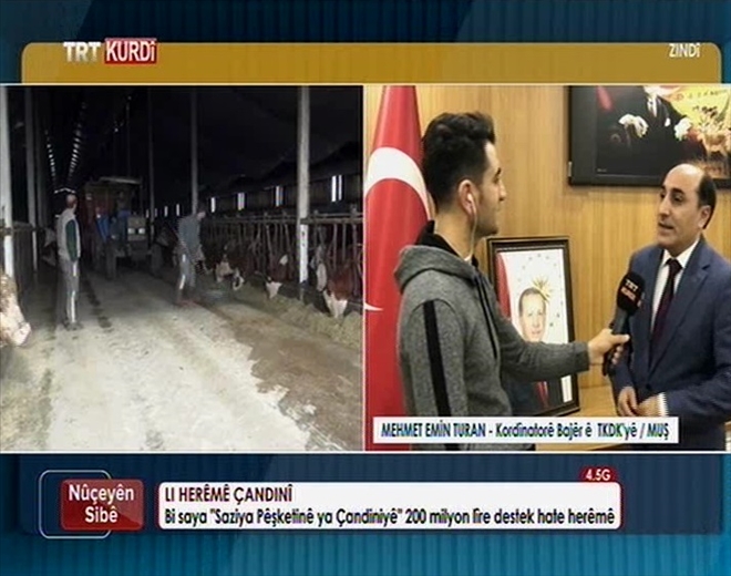 Tarım ve Kırsal Kalkınmayı Destekleme Kurumu (TKDK)Muş İl Koordinatörü Mehmet Emin Turan, TRT Kurdî kanalının sabah haberlerine canlı yayın konuğu olarak Muş´ta hayata geçirilen projelerle ilgili değerlendirmelerde bulundu.