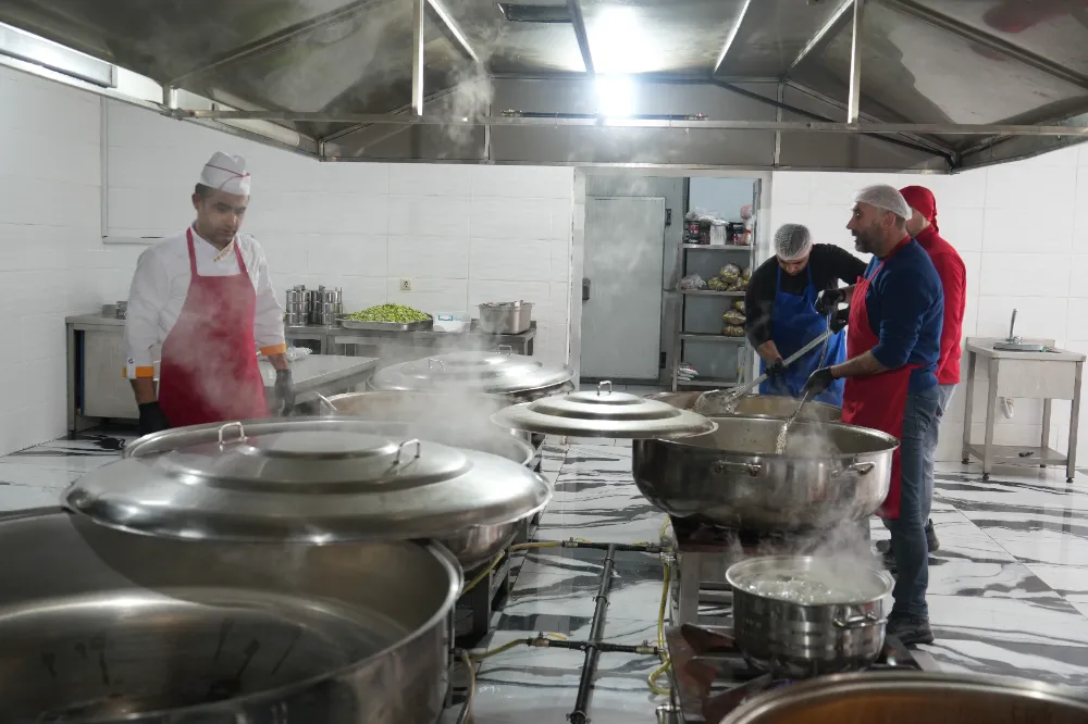 Türk Kızılay'a ait aşevinde ihtiyaç sahibi bin 200 aile için pişirilen sıcak yemekler görevlilerce titizlikle hazırlanıyor.