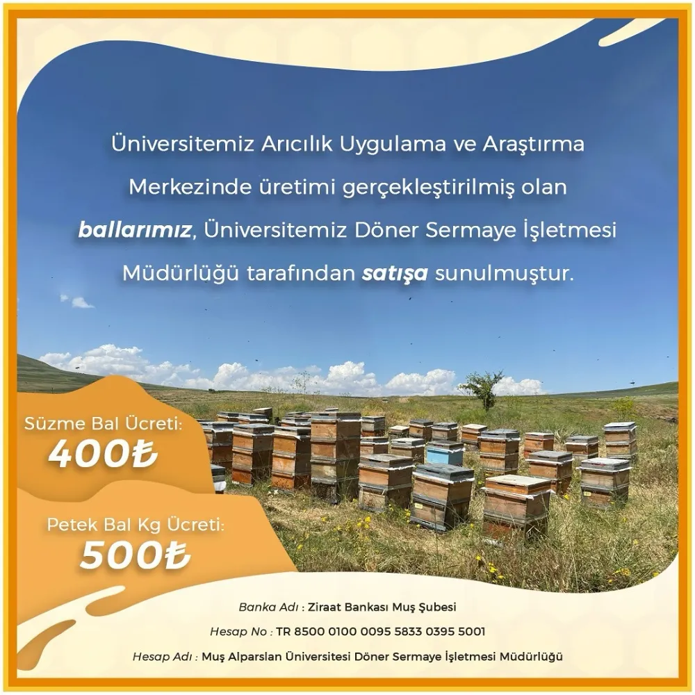 Muş Alparslan Üniversitesi tarafından üretilen balın satışına başlandı. Döner sermaye işletmesi tarafından satışa sunulan süzme balın kilogramı 400 TL, petek balın kilogramı da 500 TL’den satılacak