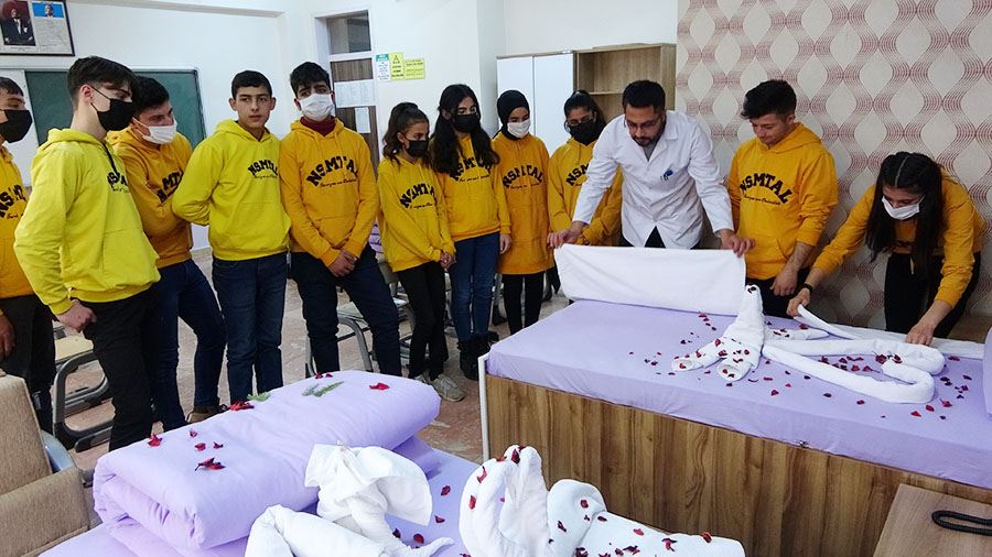 Konaklama ve Seyahat Hizmetleri Öğretmeni Zeynep Rüzgar da, Türkiye’nin dünya turizminde ilk 10’da yer aldığını ve okul olarak önemli amaçlarından bir tanesinin de turizm sektörüne nitelikli ara eleman yetiştirmek olduğunu ifade etti. Okulda konaklama ve seyahat hizmetleri alanının yanı sıra yiyecek ve içecek alanına ait atölyelerin de bulunduğunu belirten Rüzgar, “Atölyeler haricinde bir de uygulama otelimiz var. Çocuklar okulda gördükleri uygulamalı eğitimi bir de uygulama otelinde tekrardan gerçekleştirerek otel ortamına hazırlanıyor. Beceri eğitimlerine gittikleri zaman mesleki eğitim hakkında bilgi sahibi oluyorlar. Öğrencilerimiz beceri eğitimini tamamladıktan sonra işletmelerde nitelikli personel olarak çalışabilirler ve bu çalışma esnasında akademik anlamda kendilerini geliştirerek bu sektörde kariyer basamaklarında ilerleyebilirler” ifadelerini kullandı.