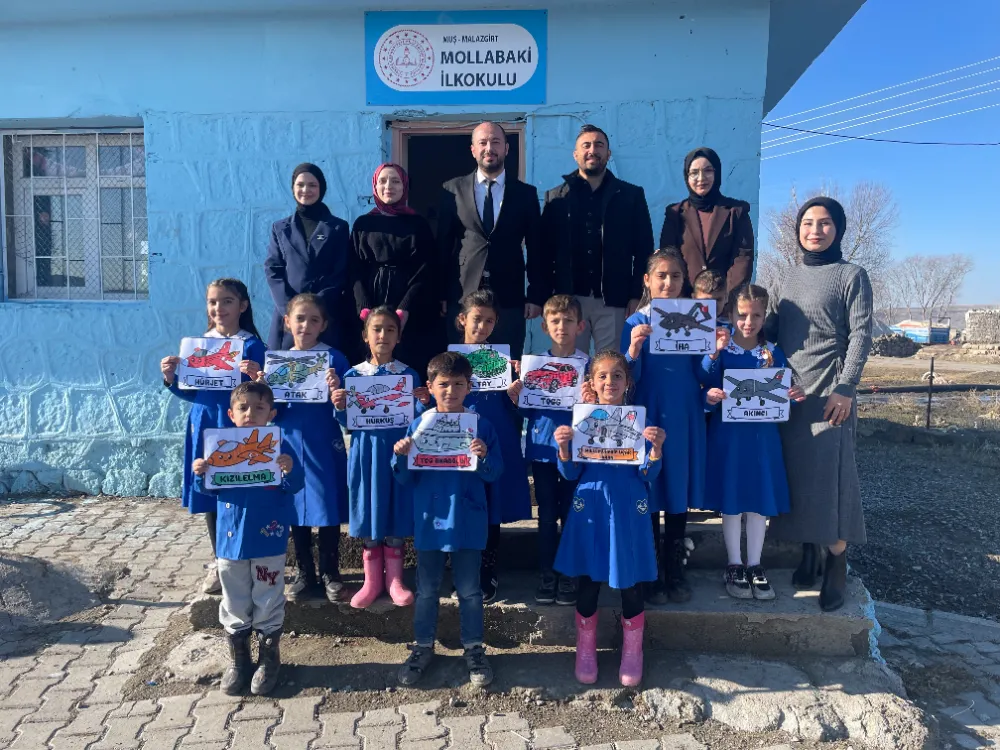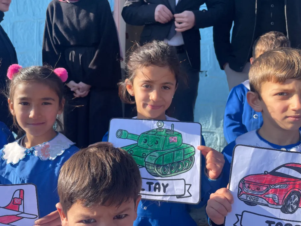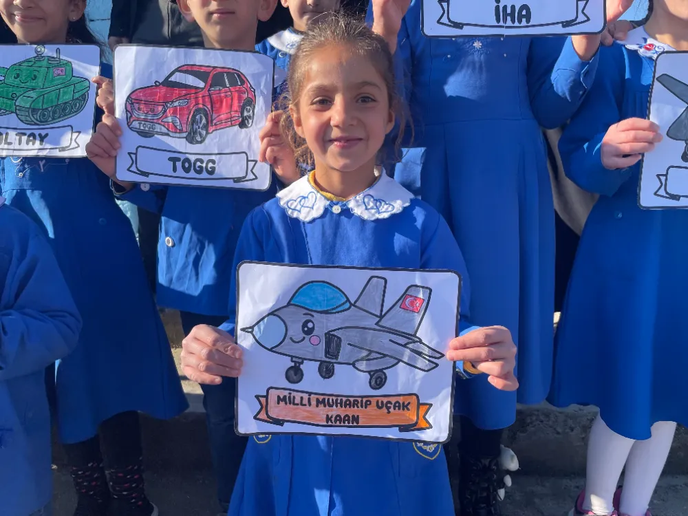 Okul Müdürü Mensur Demir ve öğretmenler, etkinliğin amacını şu sözlerle anlattı: "Bu çalışmayı Tutum, Yatırım ve Türk Malları Haftası kapsamında gerçekleştirdik. Amacımız çocuklarımıza ülkemizin kendi imkânlarıyla ürettiği teknolojileri tanıtmak ve erken yaşta farkındalık oluşturmaktı. Öğrencilerimiz savunma sanayimize ait araçları hayal güçleriyle çizdi, biz de bu çizimleri yapay zekâ desteğiyle canlandırdık. Çocuklarımızın heyecanı ve mutluluğu her şeye değerdi. Burada gördüğümüz şey sadece bir resim değil; minik ellerden çıkan büyük bir vatan sevgisidir. Yerli ve millî değerlerle yetişen bu çocuklar, gelecekte ülkemiz için daha iyisini yapma hayaliyle büyüyecek." (İHA)