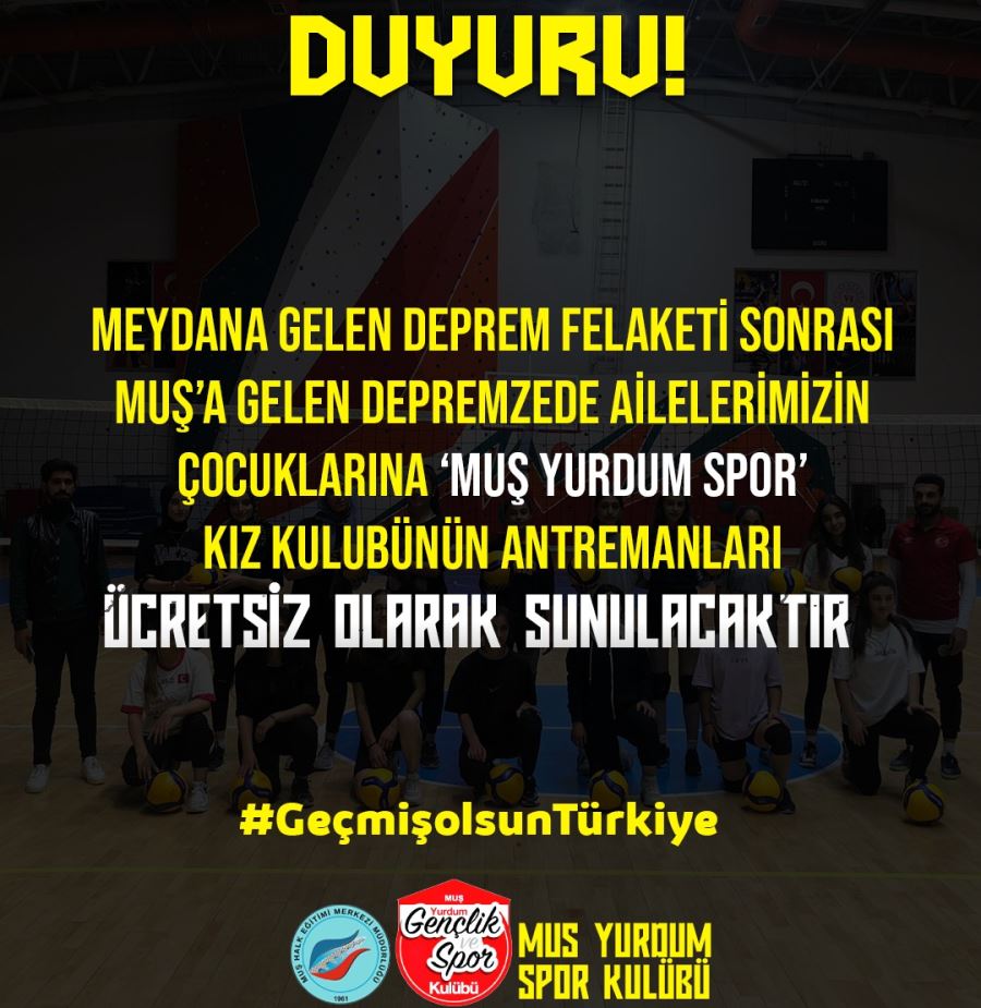 Bu çerçevede Muş’ta çeşitli spor branşlarında faaliyet gösteren Muş Yurdum Gençlik Spor Kulübü depremzede ailelerin çocuklarına ücretsiz spor eğitimi vereceğini açıkladı. Depremzede ailelerden isteyenlerin çocuklarını Muş Yurdum Gençlik Spor Kulübünü tüm spor branşlarında başlayacak olan antrenmanlara katılımlarını sağlayarak rehabilitasyon süreçlerine destek sunacak.