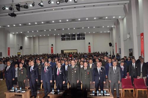 Daha sonra bir konuşma yapan Vali Seddar Yavuz, Türkiye Cumhuriyeti`nin kurucusu ulu önder Mustafa Kemal Atatürk’ü rahmetle andı. Vali Yavuz, yaptığı konuşmasında: “Değerli mesai arkadaşlarım, kıymetli öğretmenlerim ve sevgili gençler; 20`inci yüzyılın ilk çeyreğinde ulusal ve uluslararası alanda büyük değişimlere neden olan Mustafa Kemal Atatürk`ü sonsuzluğa uğurlayışımızın üzerinden 78 yıl geçti. O bir devlet adamı olduğu kadar bir halk adamı, halk adamı olduğu kadar da askeri bir deha idi. “Düşmanınız kimlerdir” diye soranlara, “Biz kimsenin düşmanı değiliz; yalnız insanlığın düşmanı olanların düşmanıyız!” demişti. Bugün 10 Kasım; 10 Kasımların, sadece matem günü olmadığını, Atatürk’ün bize bıraktığı eserlerin zenginleştirilmesine ve yeni nesillere daha iyi anlatılmasına vesile olması en büyük arzumuzdur. 10 Kasımların Atatürk’ün hayatını, mücadelesini, milletimize kazandırdıkları ve kazandırmak istediklerini doğru anlama bakımından önemi çok büyüktür” dedi.