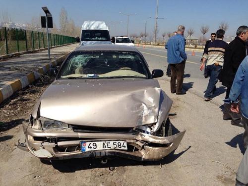 Muş-Bitlis Karayolunda meydana gelen trafik kazasında, 3 kişi yaralandı. Kaza ile ilgili alınan bilgiye göre, Cezmi Saysal yönetimindeki 49 D 5482 plakalı kamyonet, Muş Şeker Fabrikası önünde karşı yönden gelen Celal Beyazçiçek`in kullandığı 49 AE 584 plakalı otomobille çarpıştı. Kazada, sürücü Beyazçiçek ile otomobilde bulunan Maşallah Beyazçiçek ve Kenan Özkan yaralandı. 112 Acil Servis ekipleri ve çevredekilerin yardımıyla araçlardan çıkarılan yaralılar, ambulanslarla Muş Devlet Hastanesine kaldırıldı. Yaralıların sağlık durumunun iyi olduğu öğrenildi. Öte yandan Trafik Polisi, İtfaiye ve 112 Acil Servisi Ambulanslarının zamanında olaya müdahale etmesi ise gözlerden kaçmadı.