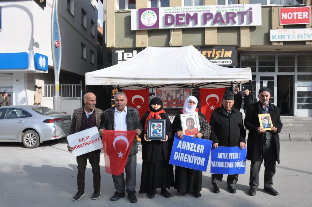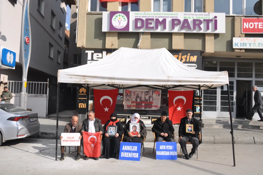 Muş’ta çocukları terör örgütü PKK tarafından kaçırılan aileler, DEM Parti il binası önündeki oturma eylemini kararlılıkla sürdürüyor.