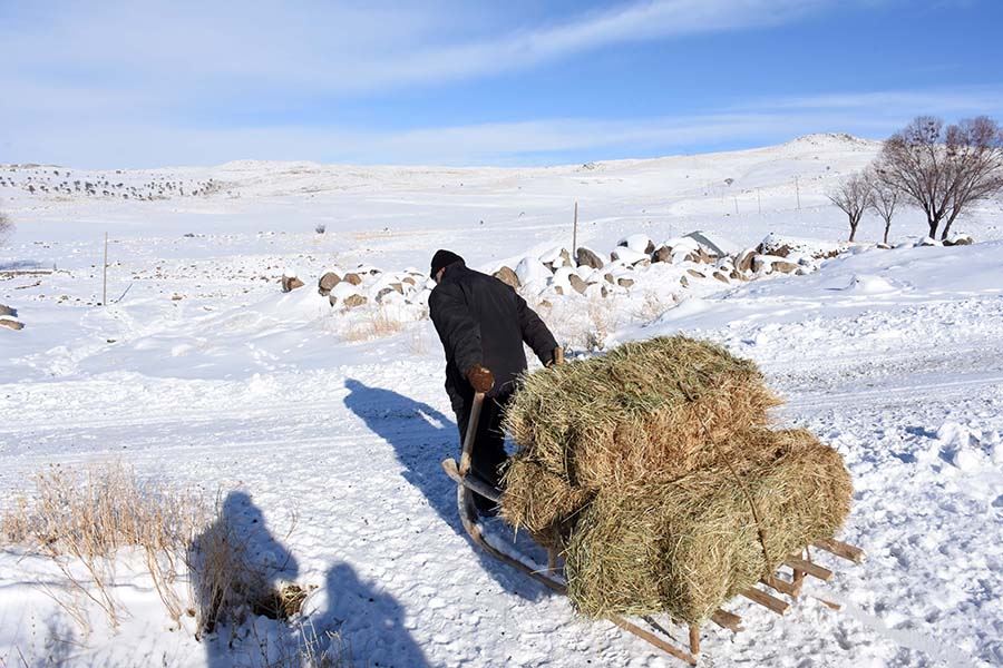 Hayvancılık yaparak ailelerini geçindirdiklerini belirten Kaya, "Çoğu zaman köyümüzde fırtına, rüzgar ve kar etkili oluyor. Bazı yıllar 2,5 metre kar yağıyor. Bu bölgede 5 ay boyunca hayvanları karın üzerinde beslediğimiz için zorlanıyoruz. 250 küçükbaş hayvanım için 85 ton saman ve 8 ton arpa biriktirdim. Kışın samanların torbalara doldurulması ve taşınması çok zor. Fırtına olduğu için hayvanları beslemek imkansız hale geliyor. Otları kızaklarla ya da sırtımızda taşıyoruz. Günde iki kez hayvanlara yem veriyoruz." ifadelerini kullandı.