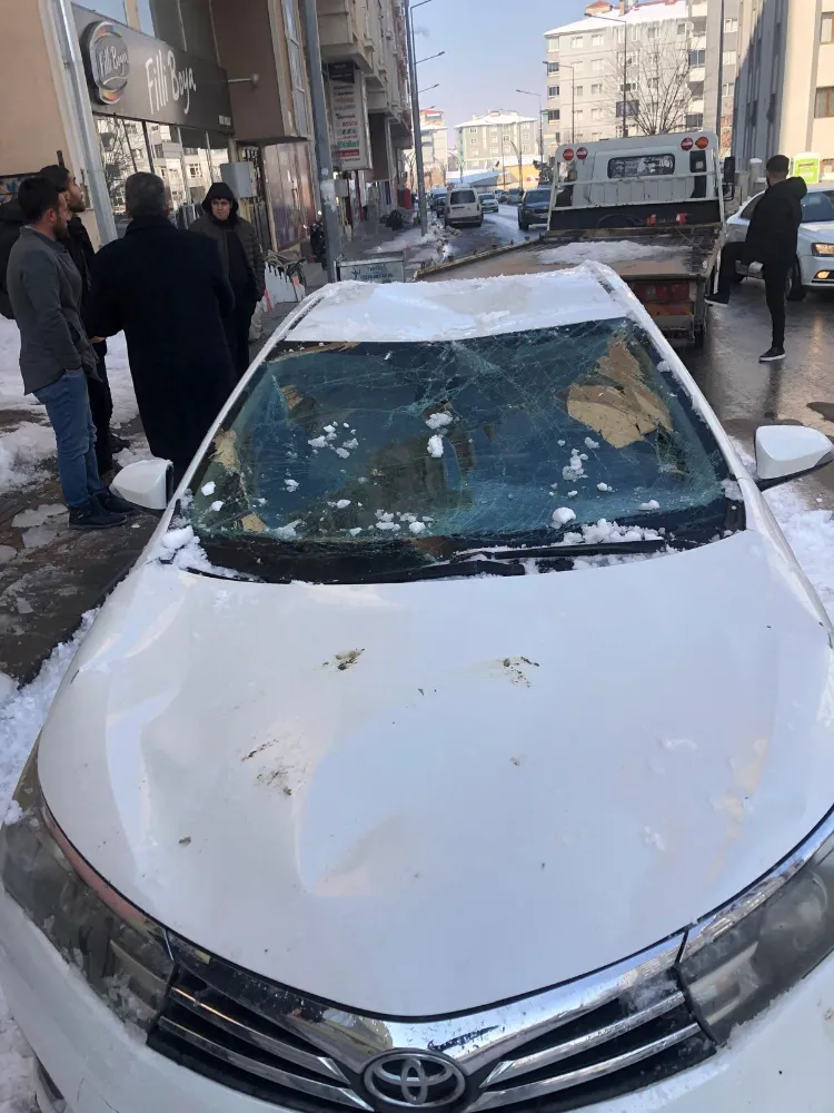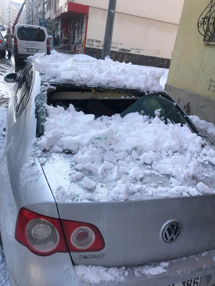 ÇATIDAN DÜŞEN KAR KÜTLESİ 2 ARACA ZARAR VERDİ