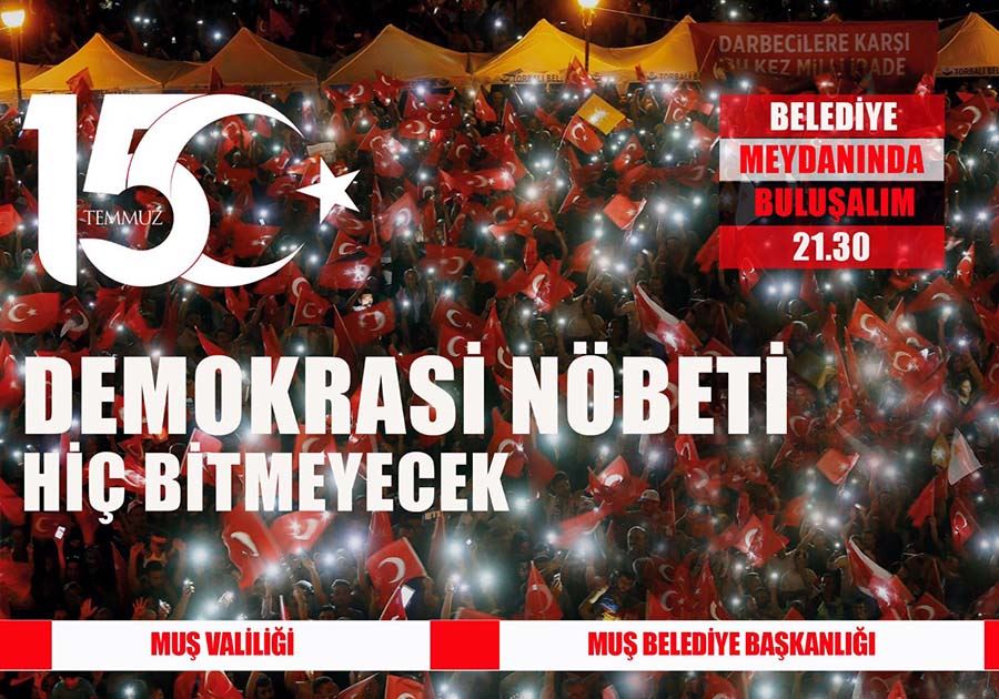 Muş’ta, 15 Temmuz darbe girişiminin beşinci yıldönümünde, FETÖ ile mücadelenin kararlı bir şekilde sürdürülmesini ve toplumsal hafızanın diri tutulmasını temin etmek için 15 Temmuz Demokrasi ve Milli Birlik Günü Anma Etkinlikleri kapsamında akşam saat 21.30’da belediye meydanında “Demokrasi nöbeti hiç bitmeyecek” etkinliği düzenlenecek.