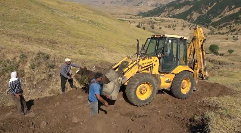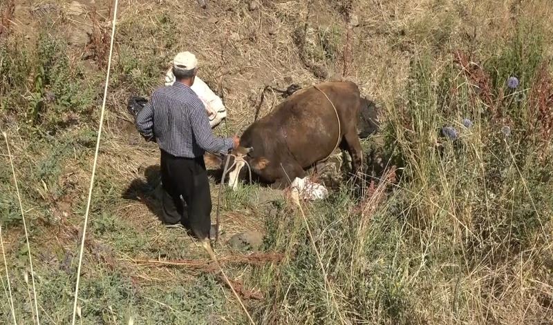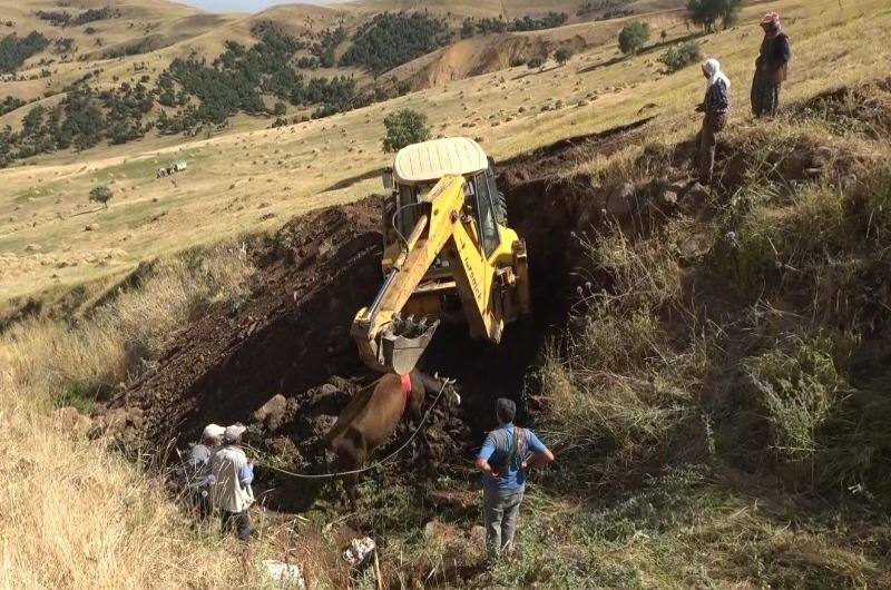 Köy sakinlerinden Eyüp Omur, “İneğinin kayıp olduğunu İbrahim bize haber verdi. Yaptığımız aramalar sonucu köyün aşağı tarafında ineğin dereye düştüğünü fark ettik. Köylüler olarak yaklaşık 7 saat yaptığımız çalışma sonucu ineği düştüğü yerden çıkaramadık. Daha sonra özel idare ekiplerine haber verdik. Ekiplerin yoğun çalışması sonucu kepçe ile ineği çıkarttık. İnek şu anda ayağa kalkamıyor, onun için kepçe ile köye getirdik” dedi.