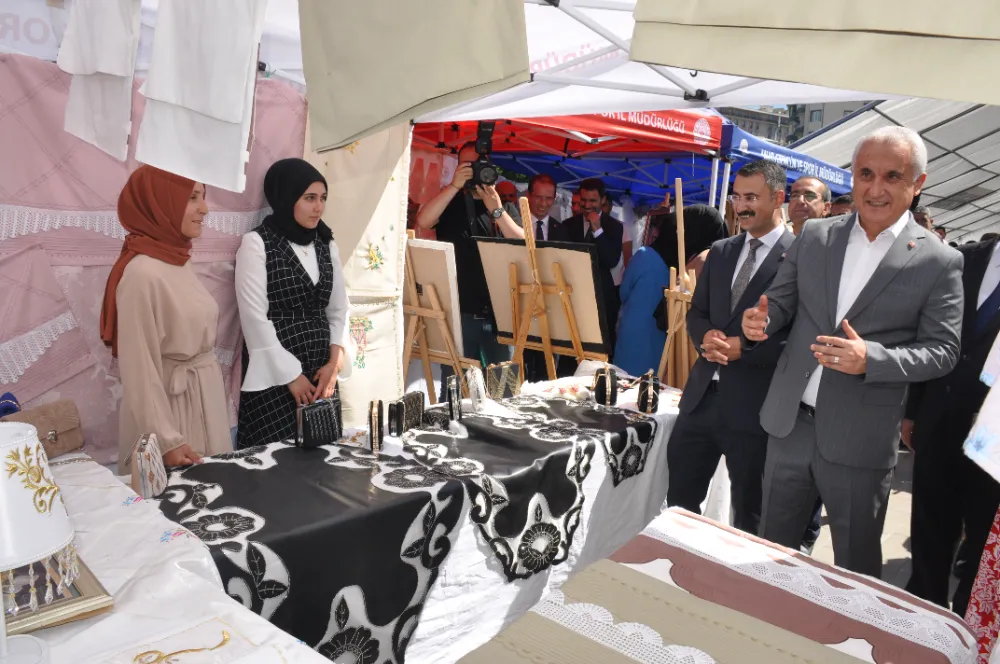 Kent Meydanı’nda düzenlene sergi saygı duruşunda bulunulması ve İstiklal Marşı’nın okunmasıyla başladı. Programda bir konuşma yapan Vali Avni Çakır, yaklaşık bin 500 kursa 25 bin dolayında kursiyerin katıldığını söyledi. Açılan kurslara özellikle kadınların katılmaları çağrısında bulunan Vali Avni Çakır, “Yaklaşık bin 500 civarında kursumuz 25 bin civarında da kursiyerle kurslarımızın son kapanış sergisine ulaşmış bulunuyoruz. Amacımız eğitim hayatını bir şekilde noktalamış, yarım kalmış, özellikle kadınlarımızın, gençlerimizin kendilerini hayatlarına, ailelerine, bundan sonraki yaşantılarına çok daha güçlü, çok daha donanımlı bir şekilde hazırlamak amacıyla açmış olduğumuz Halk Eğitim kurslarımıza çok ciddi bir katılım oldu. Bu kurslarda amacımız kadınlarımızı, gençlerimizi geleceğe daha güçlü bir şekilde hazırlamak, onların niteliklerini arttırmak, onların olan becerilerinin açığa çıkmasını fırsat vermek ve bu konuda emsallerine göre, daha ileri gidenlere de ticari bir takım kapıları da açmak” dedi.