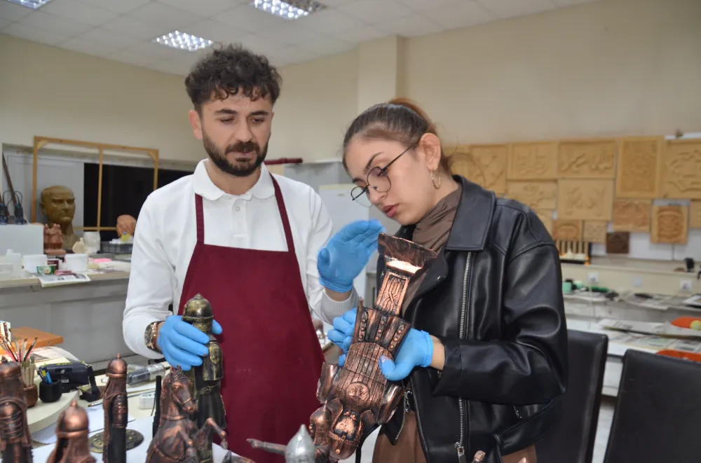 Üniversite yerleşkesi içerisindeki sanat ve heykel atölyelerinde yürütülen çalışmalarda, Sultan Alparslan’ın zırhı, atı ve sembolik duruşunu yansıtan figürler ön plana çıkıyor. Tamamı el emeğine dayalı olarak üretilen bu eserler, öğrencilerin bireysel tasarımlarını ve estetik yaklaşımlarını yansıtması bakımından da önem taşıyor.