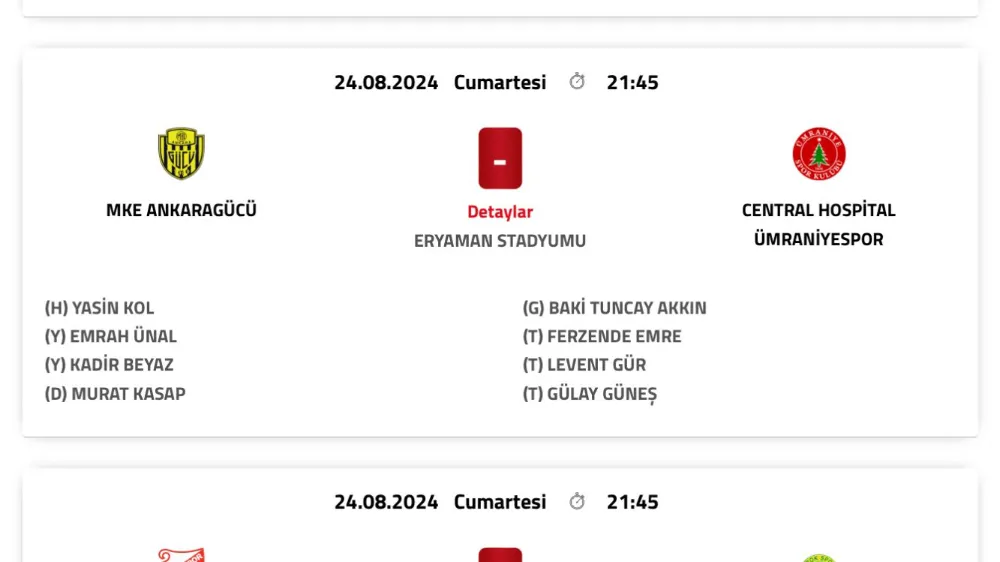 Trendyol 1. Ligin 3. Haftasında 24 Ağustos 2024 Cumartesi günü saat 21.45’te oynanacak olan Ankaragücü-Central Hospital Ümraniyespor karşılaşmasını Yasin Kol yönetecek. Kol'un yardımcılıklarını Emrah Ünal ve Kadir Beyaz yaparken, dördüncü hakem ise Murat Kasap görevlendirildi. Baki Tuncay Akkın'ın gözlemci olarak görev alacağı karşılaşmaya TFF tarafından hemşehrimiz Ferzende Emre’nin yanı sıra Levent Gür, Gülay Güneş temsilci olarak atandı.