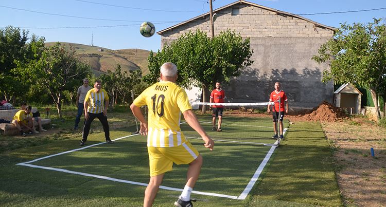 Akın Polat'ın tahsis ettiği bahçede eski sentetik çim ve fileyle ayak tenisi kortu oluşturan futbolcular, ilk maçı da kendileri yaptı.