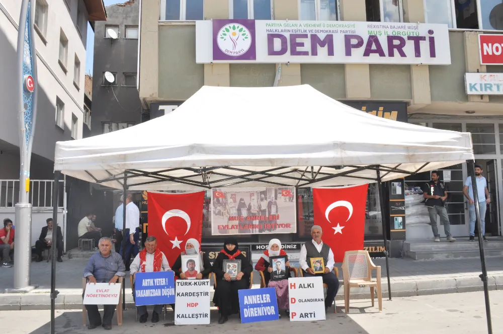 Muş’ta çocuklarını terör örgütü PKK’nın pençesinden kurtarmak isteyen ailelerin DEM Parti il binası önündeki eylemi devam ediyor. Aileler, çocuklarının en kısa sürede güvenli bir şekilde evlerine dönmesini beklerken, toplumun da bu konuda destek olmasını istedi. Çocuklarına kavuşma ümidiyle her hafta çarşamba günü DEM Parti il binası önünde bir araya gelen aileler, "Anneler direniyor" ve "Yeter artık evlatlarımızı bırakın" pankartları açtı. Anne ve babalar, yıllardır hasretle bekledikleri çocuklarına teslim olmaları için çağrıda bulundu.