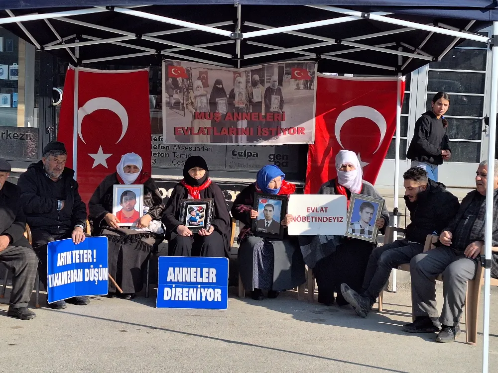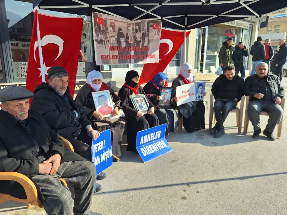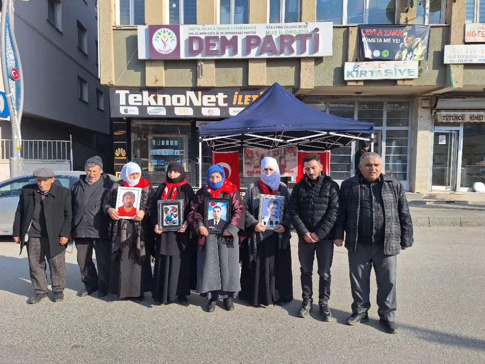Çocuklarının terör örgütü PKK tarafından dağa götürüldüğünü belirten aileler, Muş’ta DEM Parti İl Başkanlığı önünde başlattıkları evlat nöbetini bu hafta da sürdürerek çocuklarına teslim olmaları çağrısında bulundu.