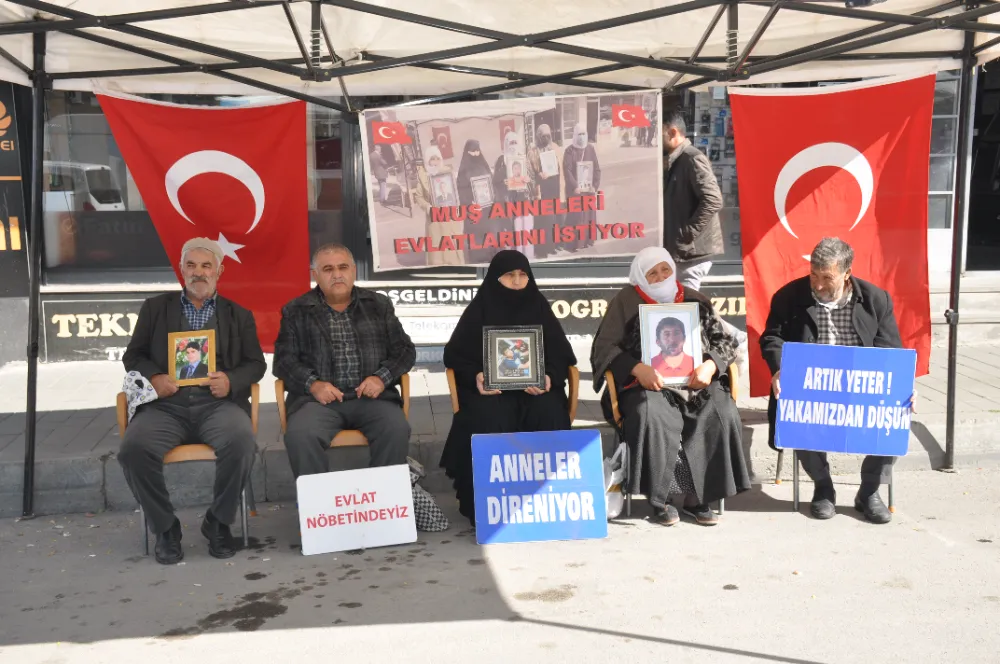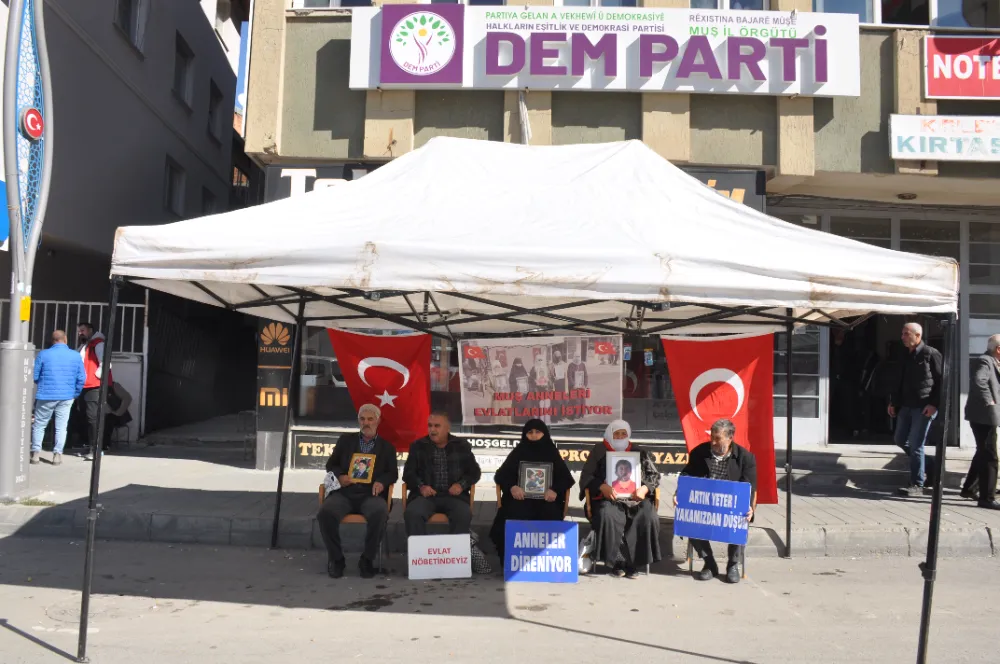 Muş’ta çocuklarının terör örgütü PKK mensupları tarafından dağa kaçırıldığı iddiasıyla DEM Parti İl Başkanlığı önünde oturma eylemi başlatan aileler, 168 haftadır kararlı bir şekilde devam ettirdikleri evlat nöbetini sürdürüyor.