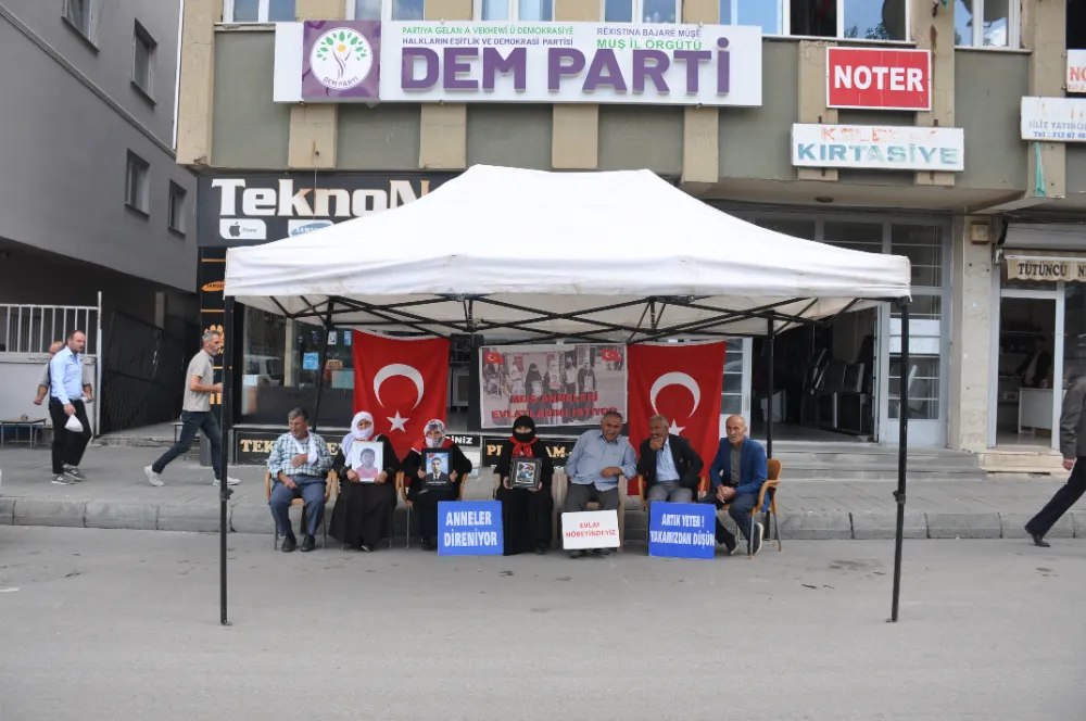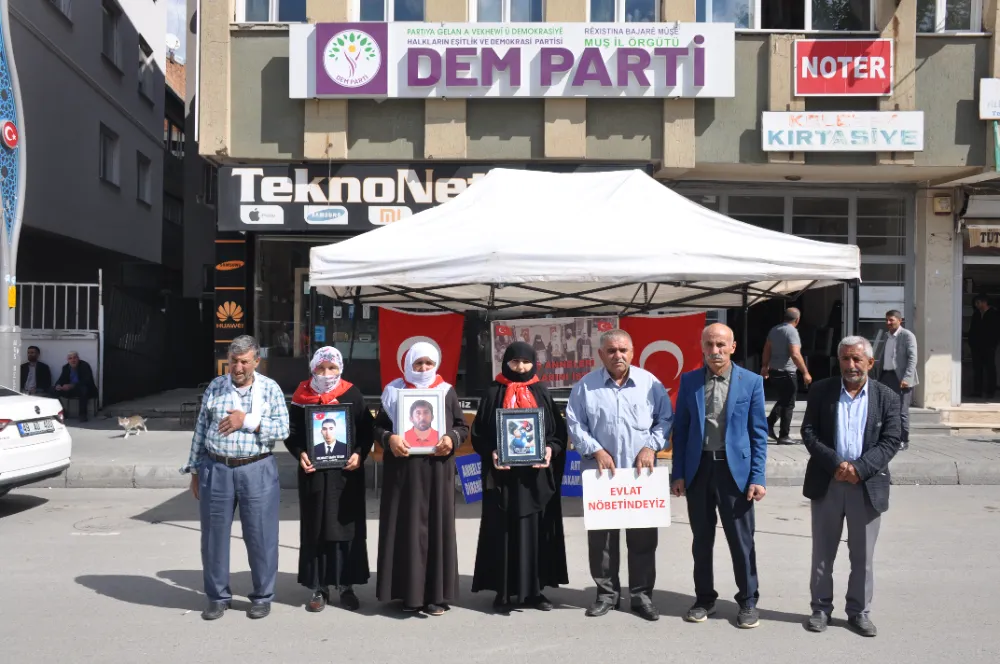 Çocuklarının terör örgütü PKK mensupları tarafından dağa kaçırıldığı iddiasıyla 165 haftadır DEM Parti Muş İl Başkanlığı önünde oturma eylemi başlatan ailelere bir aile daha katıldı.