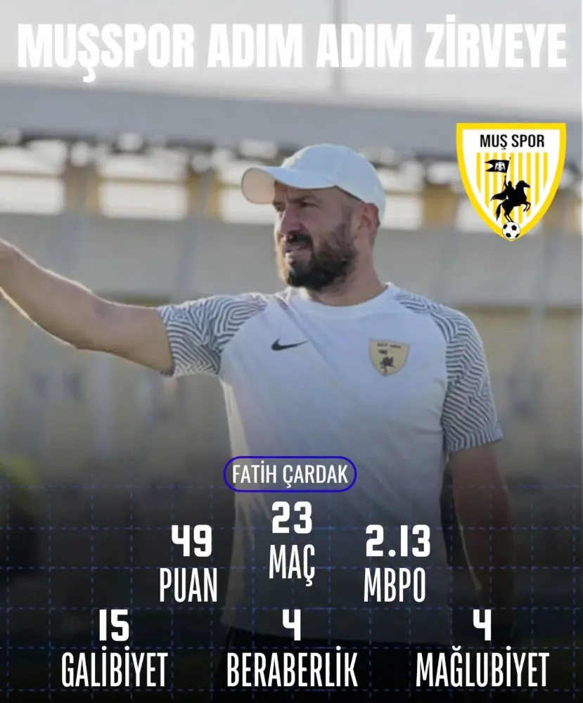 Bu sezon Muşspor’un başında 23 lig maçına çıkan Fatih Çardak, 15 galibiyet, 4 beraberlik ve 4 mağlubiyet alarak 2,13 puan ortalaması yakaladı. Menemen FK galibiyetiyle birlikte 49 puana ulaşan Muşspor, ligde 2’nci sıraya yükselirken, liderle arasındaki puan farkını 2’ye düşürdü. Sarı-beyazlı ekip, kalan haftalarda zirve mücadelesini daha da yukarı taşımayı hedefliyor.