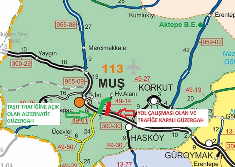 Muş Karayolları 113. Şube Şefliği tarafından yapılan açıklamada, 49-14 KK numaralı Muş-Havalimanı yolunun, yol yapım çalışmaları kapsamında taşıt trafiğine kapatıldığı bildirildi. Açıklamada, söz konusu yolun 14 Temmuz 2025 tarihinde saat 22.00 itibarıyla ulaşıma kapandığı belirtildi. Çalışmaların yürütüldüğü 0+000 ile 5+600 kilometreleri arasındaki kesimde ulaşımın sağlanamayacağı, bu nedenle sürücülerin alternatif güzergah olarak Sungu beldesinden geçen yolu kullanmaları gerektiği kaydedildi.