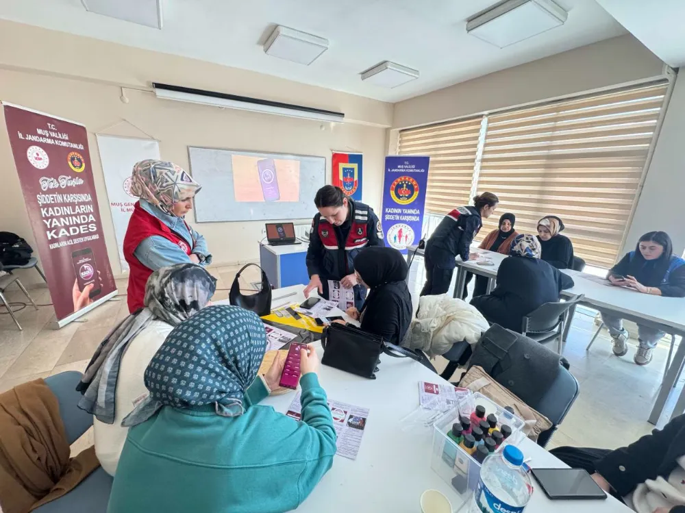 Muş İl Jandarma Komutanlığı Asayiş Şube Müdürlüğü bünyesinde görev yapan Aile İçi Şiddetle Mücadele ve Çocuk Kısım Amirliği personelleri tarafından düzenlenen etkinlikte, kadınların hakları, yasal koruma mekanizmaları ve başvuru yolları hakkında kapsamlı bilgiler paylaşıldı. Programda özellikle Kadın Destek Uygulaması (KADES), 6284 sayılı kanun ile erken yaşta ve zorla evlilik konuları ele alındı.