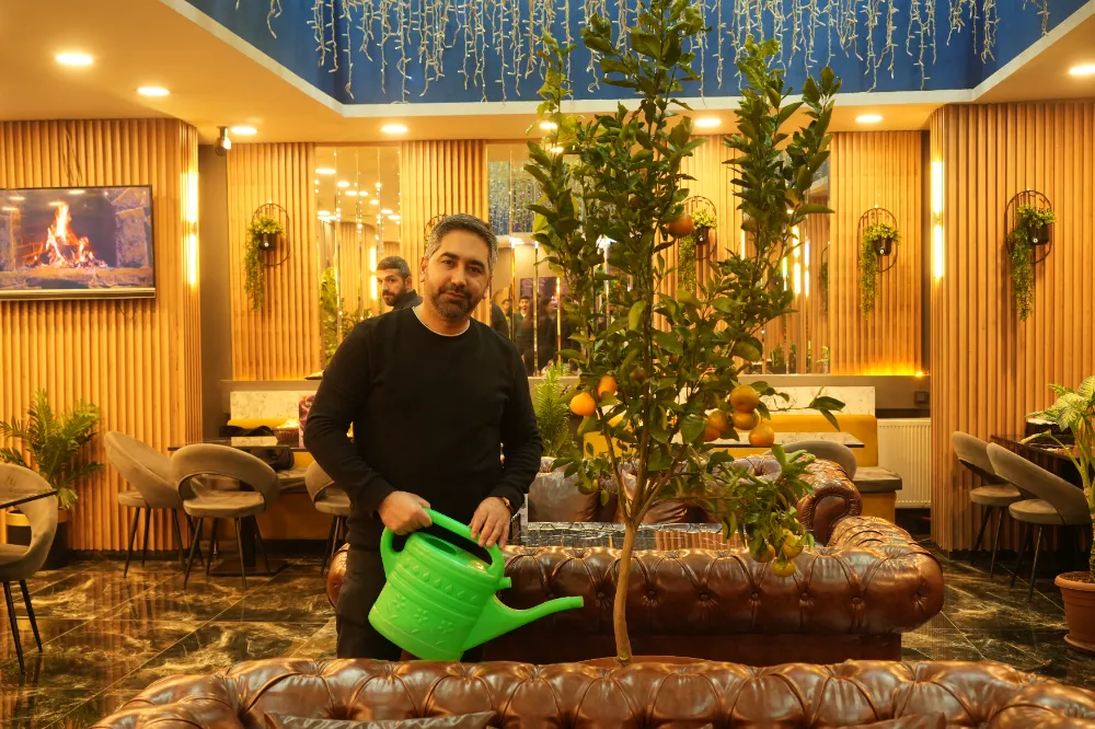Saksıda yetiştirdiği mandalina ağaçlarıyla kafesine doğal bir atmosfer katan Nezir Yolcu, olgunlaşan meyveleri müşterilere ikram ederek farklı bir deneyim sunuyor.