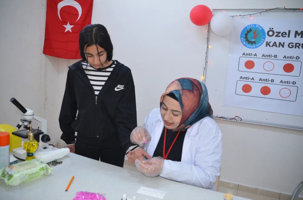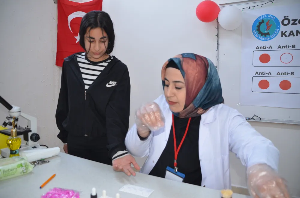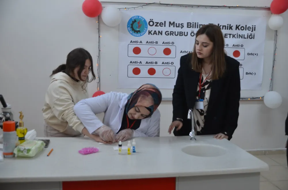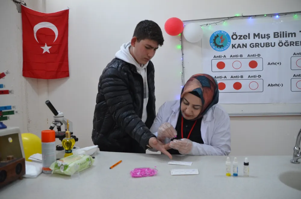 Muş Organize Sanayi Bölgesinde devlet desteğiyle kurulan ve 30 öğretmen, yaklaşık 590 öğrencinin eğitim aldığı Muş Özel Bilim Mesleki ve Teknik Anadolu Lisesinde geliştirilen yöntemle 3 saniyede kan grupları tespit ediliyor.