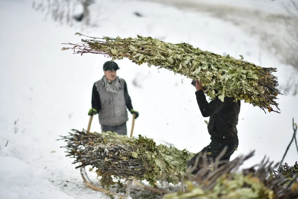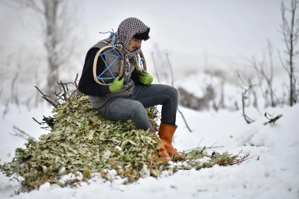 Kar kalınlığının yer yer 3 metreyi bulduğu bölgede besiciler, yaz aylarında topladıkları meşe yapraklarını kış boyunca hayvan yemi olarak kullanıyor. Yaz aylarında traktörlerin giremediği sarp arazilerde meşe yapraklarını toplayan, kışın da kızaklara yükleyen besiciler, yaklaşık 2 kilometrelik yolu yürüyerek kat ediyor.