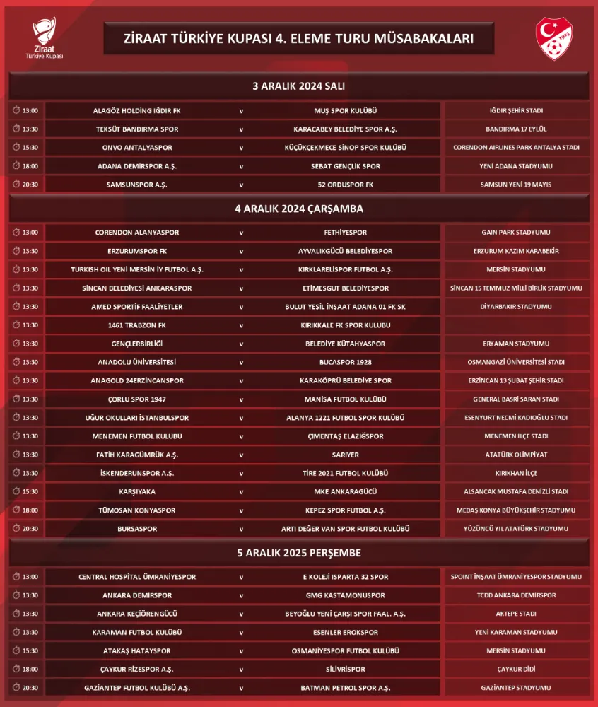 Ziraat Türkiye Kupası 4. Eleme Turu müsabaka programı, Türkiye Futbol Federasyonu'nun sitesinden duyuruldu.