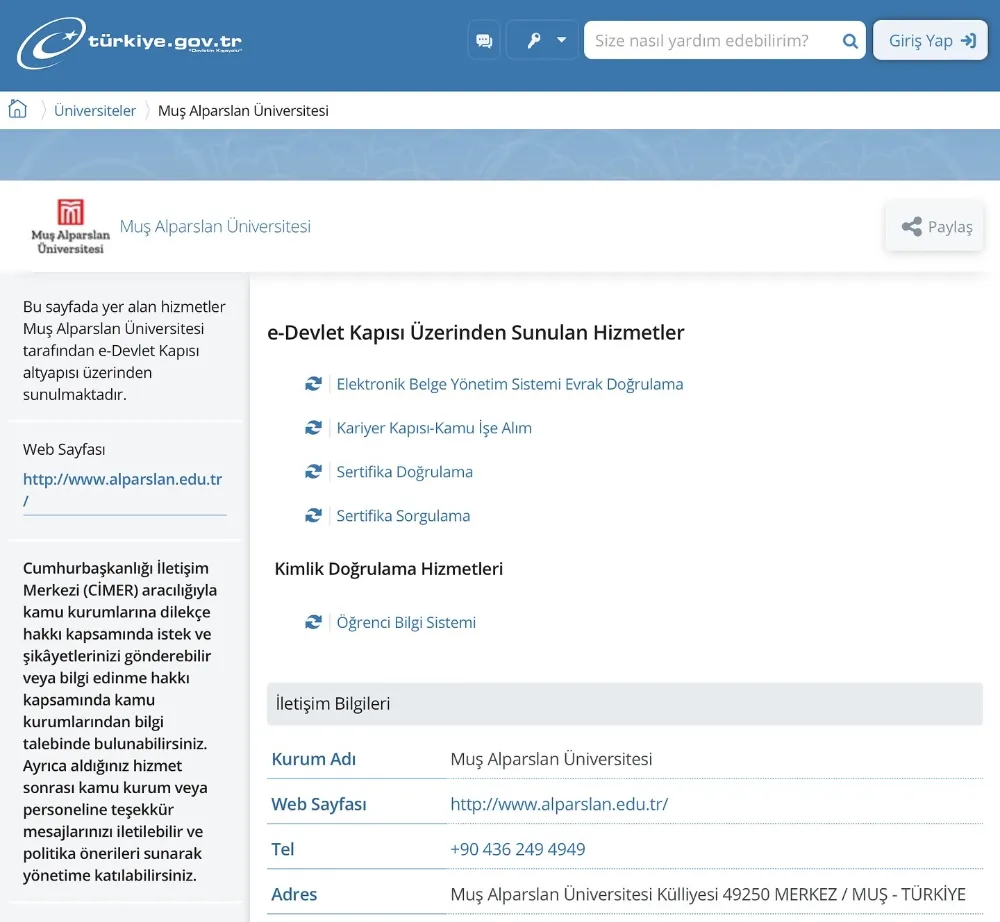 Muş Alparslan Üniversitesi Bilgi İşlem Daire Başkanlığı tarafından üniversitenin ihtiyaçlarına yönelik olarak geliştirilen Sürekli Eğitim Merkezi Yazılımı hizmete sunuldu. Konuyla ilgili üniversitenin sosyal medya hesabından yapılan açıklamada, bu yenilikçi yazılım sayesinde, üniversitenin Sürekli Eğitim Merkezi bünyesinde verilen sertifikaların e-Devlet üzerinden sorgulanabilir ve doğrulanabilir hale gelmesi mümkün olduğu belirtildi. Açıklamada, “Yeni yazılımın sunduğu bu imkan, hem kursiyerlere hem de kurumlara büyük kolaylık sağlamaktadır. Kursiyerler, aldıkları sertifikaların doğruluğunu e-Devlet sistemi üzerinden hızlı ve güvenilir bir şekilde teyit edebilirken, kurumlar da bu süreçten faydalanarak işlemlerini daha verimli bir şekilde yürütebilecektir. Muş Alparslan Üniversitesi Bilgi İşlem Daire Başkanlığı tarafından geliştirilen ve Düzce Üniversitesi Bilgi İşlem Daire Başkanlığı’nın katkılarıyla hayata geçirilen yazılım ile eğitimde dijitalleşme ve erişilebilirlik hedeflenmiştir. Muş Alparslan Üniversitesi olarak, eğitimde dijitalleşme ve yenilikçi çözümlerle öğrencilerimize en iyi hizmeti sunmaya devam ediyoruz” denildi.
