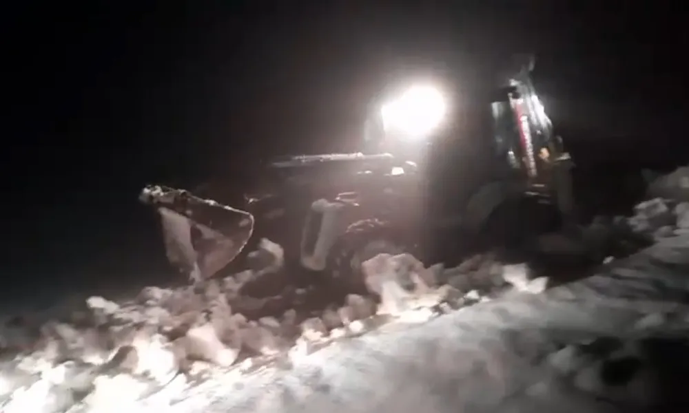 Ekipler, kardan kapanan yolu iş makinesiyle açıp minibüsün yoluna devam etmesini sağladı. Yapılan çalışmalarla yol kardan temizlenerek ulaşıma açıldı. (İHA)