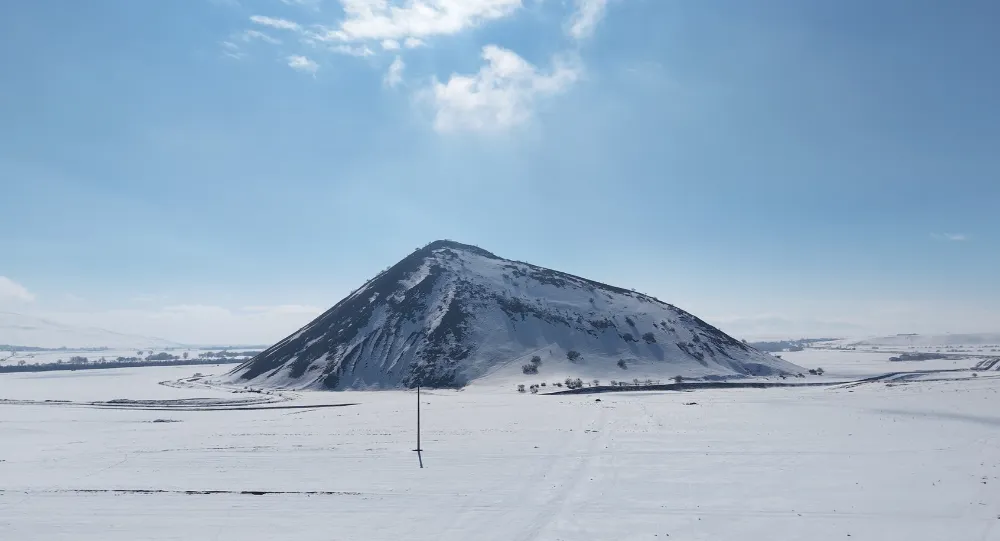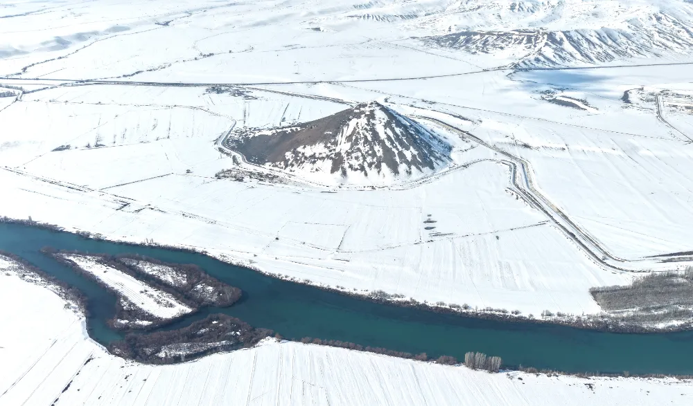 Kar yağışının ardından beyaza bürünen Mercimek Kale Höyüğü, kartpostallık manzaralar sunarken; jeomorfolog Dr. İskender Dölek, doğal ve kültürel değeriyle öne çıkan alanın jeorotalar ve kültür rotaları kapsamında turizme kazandırılması gerektiğini vurguladı.