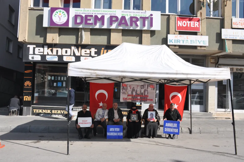 Muş'ta çocuklarını terör örgütü PKK'dan kurtarmak isteyen aileler, DEM Parti İl Başkanlığı binası önündeki eylemlerini sürdürüyor.