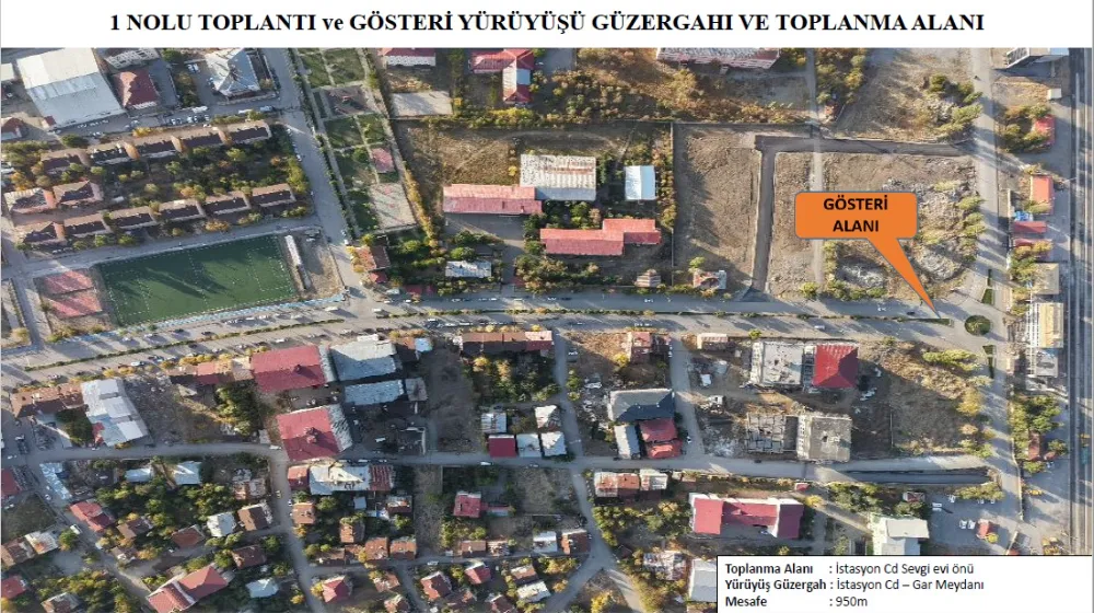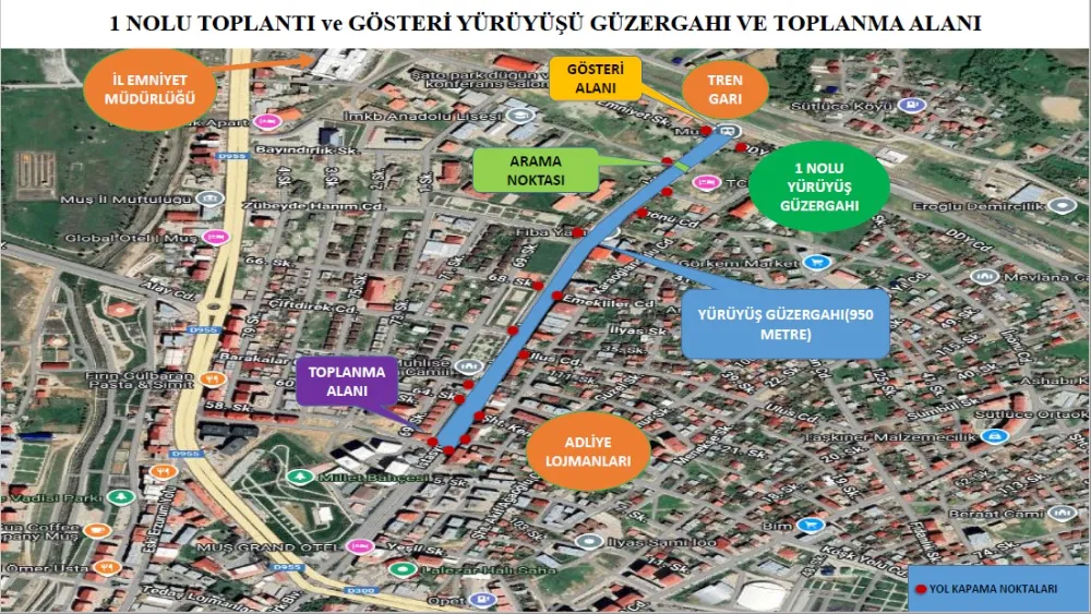 Açıklanan planlamaya göre 1 no’lu toplantı ve gösteri yürüyüşü güzergâhında toplanma yeri, Zafer Mahallesi İstasyon Caddesi üzerinde bulunan Sevgi Evleri önü olarak belirlendi. Katılımcılar, İstasyon Caddesi boyunca ilerleyerek yaklaşık 950 metrelik yürüyüşün ardından Muş Tren Garı önünde bulunan toplantı alanına ulaşacak. Toplantının ardından dağılımın ise valilik tarafından belirlenen plan ve güzergâhlara uygun şekilde yapılacağı bildirildi.