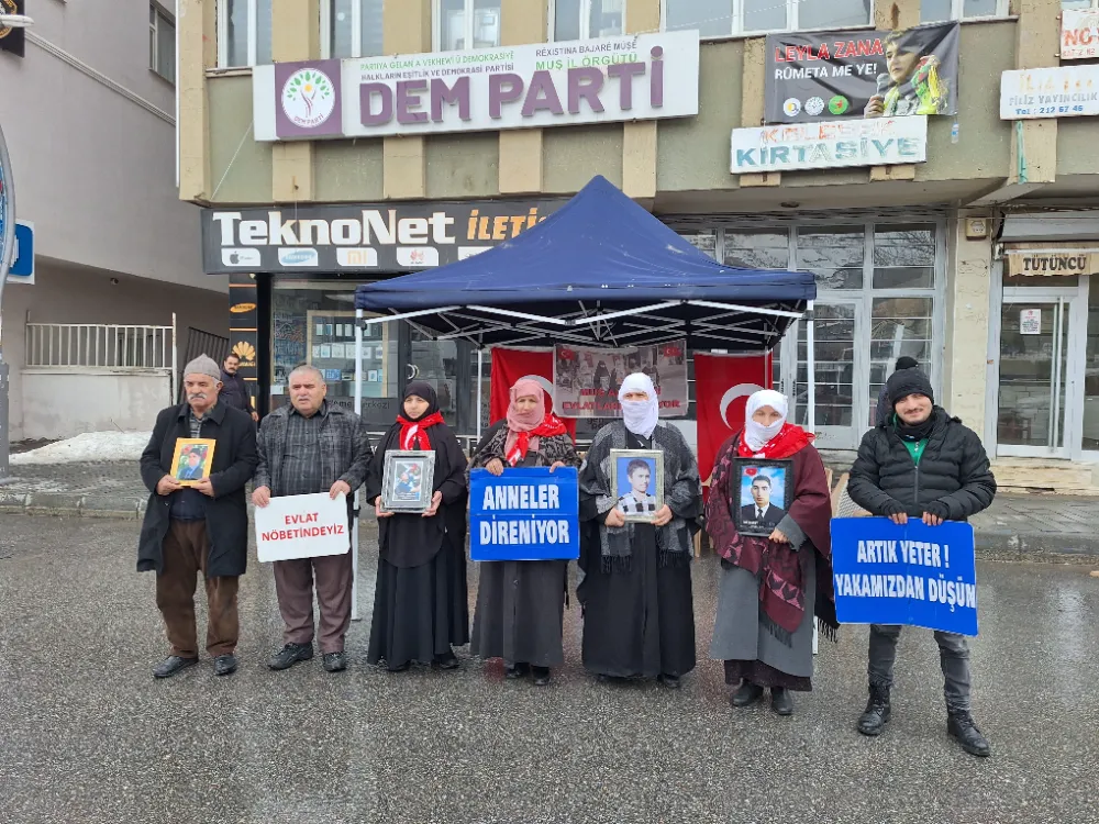 Muş’ta çocuklarının terör örgütü PKK tarafından dağa götürüldüğünü iddia eden aileler, dondurucu soğuğa rağmen DEM Parti İl Başkanlığı binası önünde sürdürdükleri evlat nöbetinde, barış sürecine dikkat çekerek çocuklarına teslim olma çağrısını yineledi.