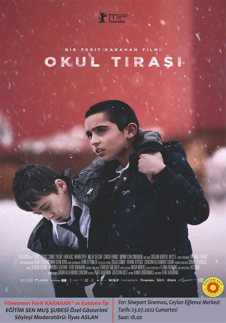 Eğitim ve Bilim Emekçileri Sendikası (EĞİTİM SEN) Muş Şubesi kültür sanat etkinlikleri kapsamında Muş’ta “Okul Tıraşı” adlı filmin özel gösterimi ve filmin yönetmeni Muşlu hemşerimiz ödüllü yönetmen Ferit Karahan’ın katılacağı bir söyleşi programı düzenliyor.