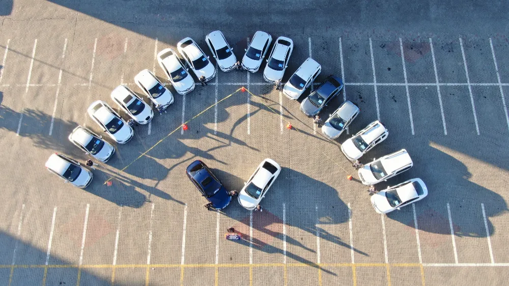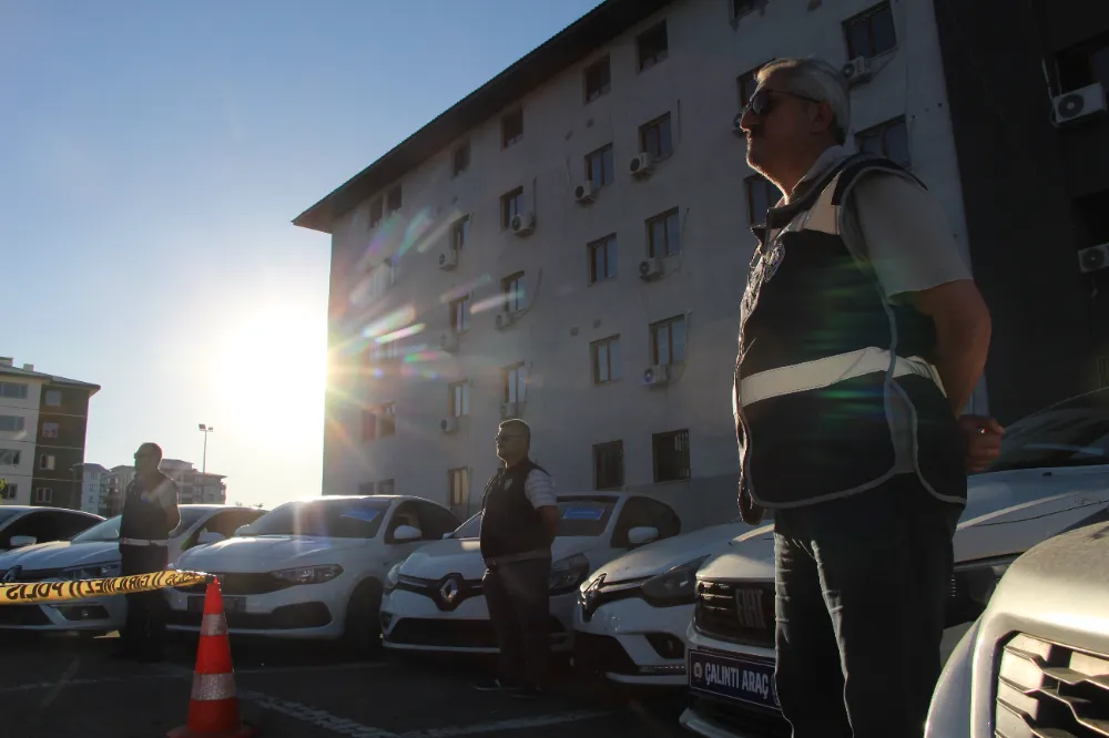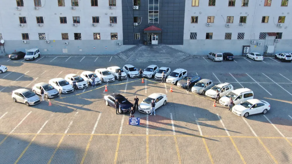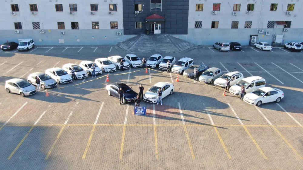 Çalıntı araçlar ise emniyet bahçesinde sergilenerek dron ile görüntülendi. (İHA)
