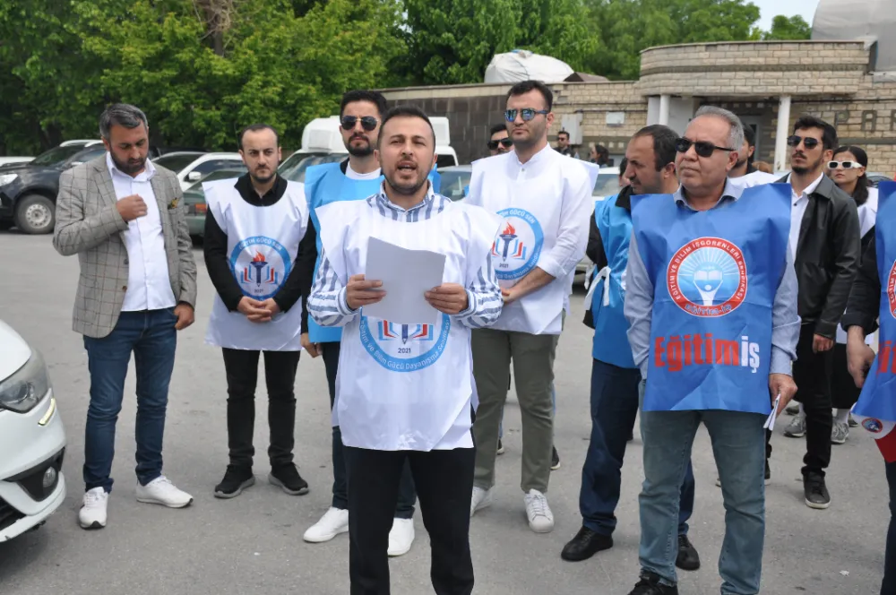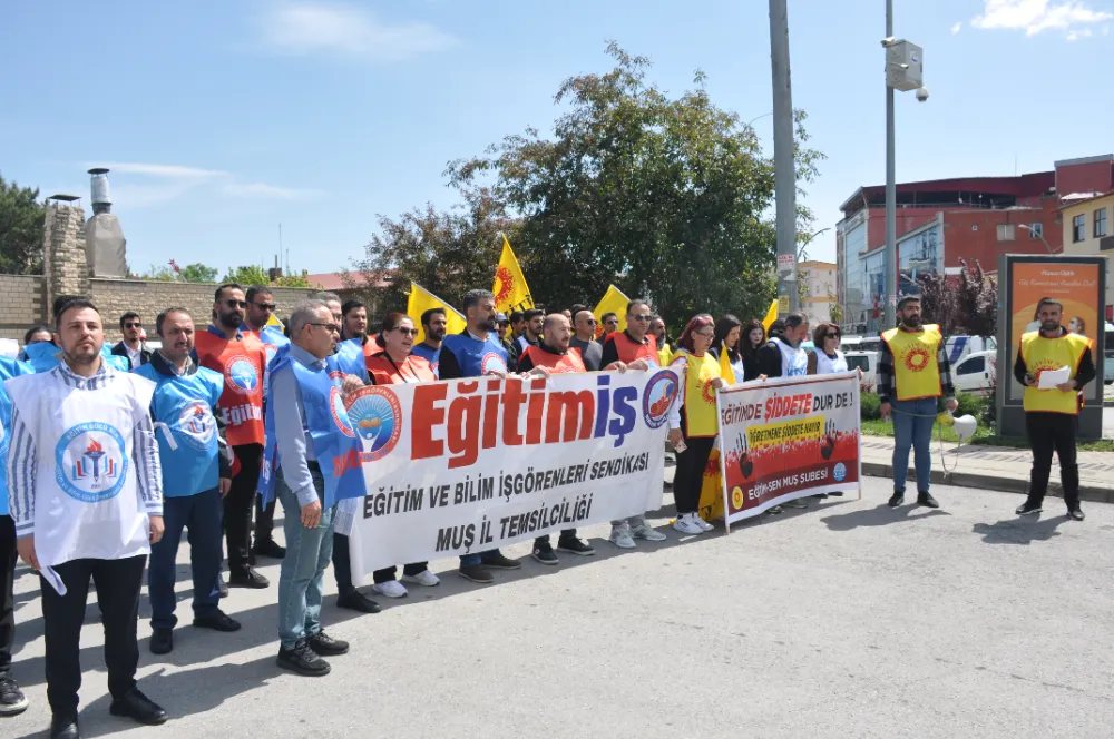 Eğitim Gücü Sendikası Muş il Başkanı Emrah Kaplan ise, okullarda artan şiddet vakaları karşısında sessiz kalmayacaklarını söyledi. Başkan Kaplan, “İstanbul’da okulda uğradığı silahlı saldırı sonucu vefat eden Okul Müdürümüz Sayın İbrahim Oktugan’a Allah’tan rahmet, ailesi, sevenleri ve eğitim camiamıza baş sağlığı diliyoruz. Eğitim kurumlarında görev yapan öğretmenler, idareciler ve eğitim çalışanları olarak, artan şiddet vakaları karşısında sessiz kalmayı reddediyoruz. Son dönemde eğitim kurumlarında yaşanan şiddet olaylarının artması, sadece bireysel değil, toplumsal bir sorun haline gelmiştir. Eğitim çalışanlarına yönelik yapılan fiziksel ve sözlü saldırılar, sadece çalışanların sağlığını tehdit etmekle kalmıyor, aynı zamanda öğrenci ve velilerin de güvenliğini tehlikeye atıyor. Milli Eğitim Bakanlığına sesleniyoruz: Eğitim çalışanlarının can güvenliği artık birinci öncelik olmalıdır. Gerekli önlemlerin alınması ve şiddetin her türlüsüne karşı sıfır tolerans politikasının benimsenmesi gerekmektedir. Eğitim çalışanlarına yönelik şiddetin ciddiyetinin farkında olduğumuzu ve bu sorunun çözümü için adım atılması gerektiğini vurguluyoruz. Eğitim çalışanlarının insanca yaşayabilecekleri bir çalışma ortamı sağlanmalı ve hak ettikleri değeri görmelidirler. Eğitim Gücü Sen olarak, 9-10 Mayıs 2024 tarihinde iki günlük iş bırakma eylemi gerçekleştireceğimizi duyuruyoruz. Bu eylem, eğitim çalışanlarının haklarına sahip çıkma ve sesimizi duyurma adına bir adımdır. Bu basın açıklamasıyla, ‘Eğitim Çalışanlarına Şiddet Yasası’nın bir an önce çıkarılmasını talep ediyoruz. Okullarımıza yeterli sayıda güvenlik görevlisi temin edilmesini istiyoruz. Bu yasal ve somut adımlar atılmadan, eğitim çalışanlarının güvenliği sağlanamaz. "Yarın da sen olabilirsin, öğretmenim" diyerek, hepimizin bu tehlikelere karşı savunmasız olabileceğini hatırlatıyorum. Hiçbirimiz bu tür bir tehlike ile yüz yüze kalmayı hak etmiyoruz. Eğitim Gücü Sendikası olarak, eğitim çalışanlarının güvenliği için mücadelemizi sürdüreceğiz. Bu zorlu mücadelede tüm eğitim çalışanlarını yanımızda görmek istiyoruz. Çünkü unutmayın, eğitim herkesin hakkıdır ve eğitimde şiddetin yeri yoktur” diye konuştu.
